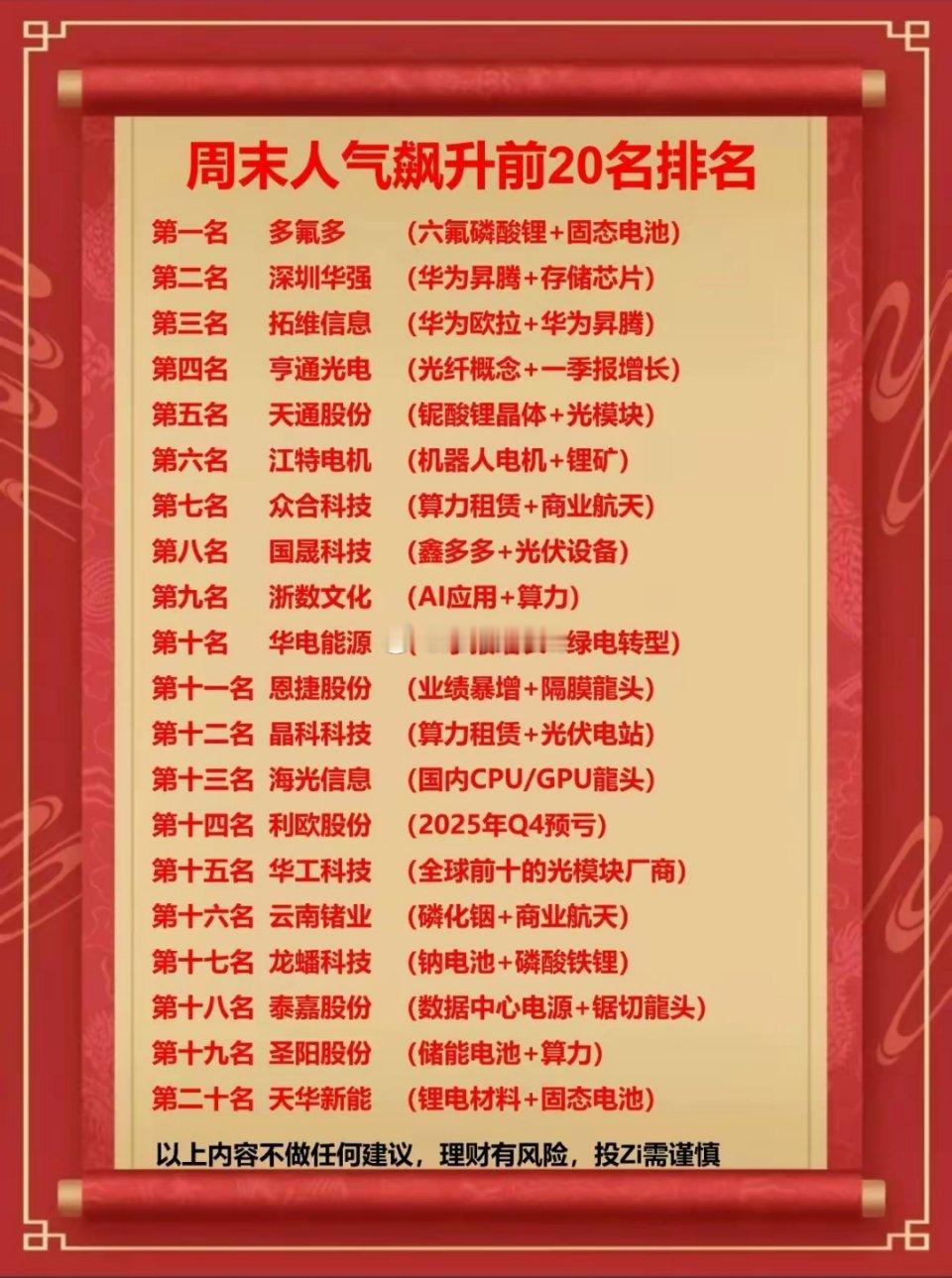 4月26日周末股市热榜 🔥📈 周末人气飙升前20名排名揭晓!4月26日周末股市热榜出炉,人气飙升前20名排名揭晓。本周不少人气股表现亮眼,像600498云南锗业本周涨幅达15.72%,材料国产概念使其异动拉升;002446中嘉博创涨12.53%,不过异动冲高要谨慎追高。本周末A股同花顺人气榜前10个股呈现能源与科技双主线共振。比如001896豫能控股,作为河南区域电力龙头,受益政策与需求提升,3月27日主力资金净流入1.32亿,股价震荡上行;605299舒华体育是国内健身器材龙头,新品推出与线上布局有望改善业绩,3月27日涨停。这些热门股值得股民多关注。