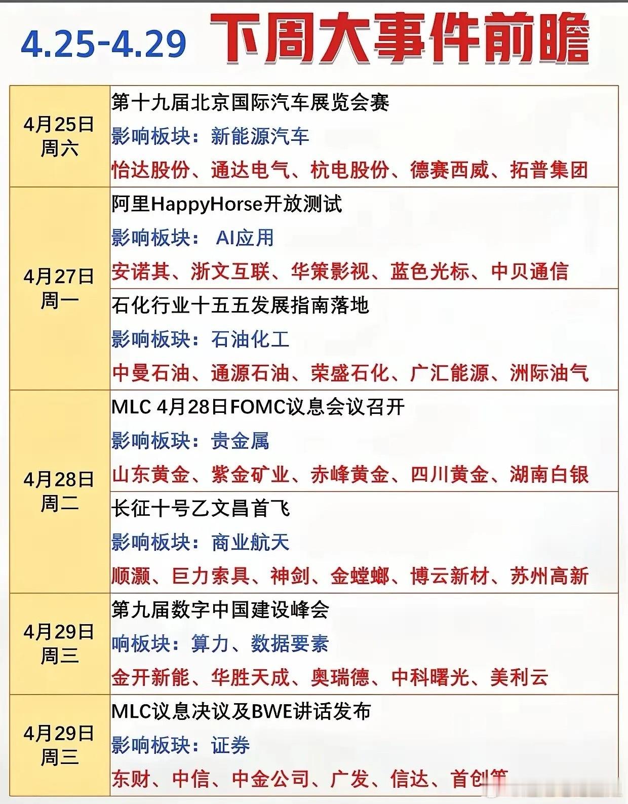 这些板块。节前事件密集催化 4.25-4.29A股六大主线投资机会解析五一长假前夕,A股市场迎来多重事件集中落地,从行业盛会、政策发布到海外议息、航天发射,各类催化因素交织,将主导短期资金流向与市场情绪。4月25日-4月29日这一周,多板块迎来事件窗口期,既蕴藏结构性交易机会,也需警惕节前资金避险带来的波动,本文结合各大事件节点,梳理核心主线与受益标的,解读市场潜在走向。4月25日,第十九届北京国际汽车展览会正式开幕,作为国内顶级车展,本次展会聚焦新能源汽车、智能驾驶、智能座舱等核心领域,多款重磅新能源车型与前沿汽车科技集中亮相,直接点燃汽车产业链市场情绪。当前新能源汽车行业逐步走出调整期,渗透率持续提升,智能化成为行业竞争核心,车展将加速行业技术落地与需求释放,带动上游零部件、汽车电子板块估值修复。该方向受益标的包括怡达股份、通达电气、杭电股份、德赛西威、拓普集团,涵盖汽车线缆、车载智能设备、底盘轻量化等核心细分领域,直接受益于行业景气度回升。4月27日迎来两大事件共振,市场关注度持续升温。其一,阿里AI视频大模型HappyHorse开放API测试,该模型此前凭借领先性能登顶全球榜单,此次开放测试标志着国产AIGC技术迈向商业化落地新阶段,将推动AI视频生成、内容创作、数字营销等应用场景快速拓展。AI应用板块历经前期调整后,迎来实质性产业催化,商用落地进程提速将直接带动相关企业业绩预期提升,受益标的聚焦安诺其、浙文互联、华策影视、蓝色光标、中贝通信,覆盖内容制作、AI营销、算力支撑等产业链环节。同日,《石化行业十五五发展指南》正式落地,政策围绕行业高端化、绿色化、精细化发展方向,推动产业结构升级,助力石化行业摆脱传统产能困境,向高附加值化工领域转型。在国际油价高位运行、行业供需格局优化的背景下,政策利好将进一步释放龙头企业盈利空间,油气开采、炼化一体化板块迎来估值修复机会,核心受益标的为中曼石油、通源石油、荣盛石化、广汇能源、洲际油气,均为行业内具备产能优势与资源储备的头部企业。4月28日,内外两大事件同步影响市场。美联储FOMC议息会议召开,作为全球资本市场核心风向标,本次议息结果将直接影响全球流动性预期与美元走势。尽管市场普遍预期维持利率不变,但美联储主席鲍威尔的讲话基调,将左右贵金属、大宗商品板块走势,叠加节前避险情绪升温,黄金等避险资产配置价值凸显,受益标的包括山东黄金、紫金矿业、赤峰黄金、四川黄金、湖南白银,充分受益于避险需求与利率预期变化。同日,长征十号乙运载火箭在文昌执行首飞任务,我国商业航天产业迎来关键里程碑,火箭发射将带动航天零部件、配套材料、航天工程服务等产业链环节发展,彰显我国航天科技实力的同时,也将提振板块市场情绪,顺灏股份、巨力索具、神剑股份、金螳螂、博云新材、苏州高新等相关配套企业有望迎来资金关注。4月29日,本周最后一个交易日迎来两大收官事件。第九届数字中国建设峰会开幕,峰会聚焦数字经济、算力基建、数据要素等核心议题,将释放多项行业利好政策。在AI算力需求持续爆发、数字经济政策持续加码的背景下,算力基础设施、数据中心板块迎来双重催化,金开新能、华胜天成、奥瑞德、中科曙光、美利云等标的直接受益于行业政策红利与需求增长。此外,美联储议息会议结果与鲍威尔讲话全面落地,若释放偏鸽派信号,将提升市场流动性宽松预期,直接利好券商板块。券商作为市场行情风向标,受益于市场交投活跃度提升与风险偏好修复,东方财富、中信证券、中金公司、广发证券、信达证券、首创证券等头部及特色券商迎来交易性机会。整体来看,节前一周市场呈现多主线轮动格局,事件催化明确的板块更容易获得资金青睐,但需注意长假前市场资金避险情绪升温,板块波动或有所加大,操作上需规避高位题材,聚焦基本面扎实、事件催化直接的核心标的,控制仓位谨慎参与。免责声明:本文仅基于公开行业事件进行客观分析,不构成任何投资建议。文中提及标的仅为事件受益逻辑梳理,不代表投资推荐。市场波动、政策落地进度、海外不确定性等因素均可能影响板块走势,投资者需自主做出投资决策,自行承担投资风险,股市有风险,入市需谨慎。