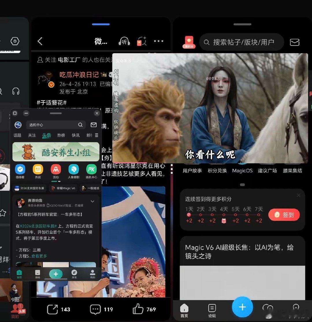 荣耀Magic V6算是把折叠屏的“生产力”焊死了。展开那块7.95英寸的内屏,真正的“巨幕时代”来了——实测一屏可同时容纳5.5个应用窗口。在满血版骁龙8 Gen5至尊版的加持下,我实现了微博、头条、荣耀俱乐部的多资讯流并行,同时后台挂B站下载、前台开微信视频,全程丝般顺滑。这种“全屏无界”的体验,才是大屏该有的终极形态。