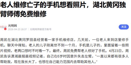 4月23日,湖北黄冈,一位老人拿着离世仅21天儿子的旧手机,蹒跚来到手机店请求维修。只有一只手的店主接过一看,竟是老款机型,足足费力拆装了一个多小时才修好。本以为要花不少钱,结果当他听到老人的一句话后,结账时,店主一个举动让老人当场红了眼眶! 说白了,这世上最动人的从来不是惊天动地的壮举,而是普通人在自己难上加难时,还愿意伸手接住别人的破碎,用一点点善意,撑起另一个人的希望。 4月23日的湖北黄冈,街头的行人步履匆匆,唯独一位老人的身影,显得格外沉重又孤单,他头发花白,满脸皱纹,步履蹒跚地挪动着脚步,每走一步都有些吃力,手里紧紧攥着一个用旧手帕层层包裹的东西,仿佛那是他失而复得的珍宝。 老人慢慢走到一家不起眼的手机维修店前,犹豫了许久,才轻轻推开那扇半掩的玻璃门,声音沙哑又微弱地问道:“师傅,能帮我修修手机吗?” 店里的店主闻声抬头,他只有一只手,另一只手臂的袖管空荡荡的,脸上带着几分温和的笑意,连忙起身招呼老人坐下,语气亲切得像对待自己的长辈。 店主接过老人小心翼翼递来的手机,拆开旧手帕的瞬间,就看出这是一部用了好几年的老款机型,机身边角早已被磨得发亮,还有几处明显的磕碰痕迹,屏幕也有些发黄,一看就用了很多年,他试着按了一下开机键,手机毫无反应,连一点灯光都不亮。 店主没有多说,拿出维修工具,用仅有的一只手,慢慢拆开手机后盖,因为只有一只手,操作起来格外费力。 他额头上渗出的细密汗珠,顺着脸颊慢慢滑落,浸湿了衣领,也没有停下手中的动作,一遍遍地检查线路、测试零件,拆装的动作虽然缓慢,却格外认真细致,每一个步骤都小心翼翼,生怕出一点差错。 就这样,足足过去了一个多小时,店主的手酸得抬不起来,肩膀也被顶得有些发麻,才终于把手机修好了,按下开机键的那一刻,手机屏幕顺利亮起,里面的照片和语音都完好无损。 老人看着亮起的手机,浑浊的眼睛里瞬间泛起了光,连忙凑过去,手指颤抖着划过屏幕,看着上面儿子的照片,嘴唇不停蠕动,却一句话也说不出来。 他缓了缓神,才想起要问维修费,脸上带着几分局促和不安,小声问道:“师傅,麻烦你了,这修手机要多少钱?我身上带的钱不多,要是不够,我再回去凑。” 店主看着老人的模样,轻声问道:“大爷,这手机对你这么重要,是家里人用的吗?”老人听到这话,眼泪瞬间就掉了下来,哽咽着说:“这是我儿子的手机,他21天前走了,这是他留给我唯一的念想,里面有他的照片和声音,我就是想再看看他、听听他的声音。” 店主听完老人的话,沉默了片刻,随即轻轻摆了摆手,用一口地道的黄冈话说道:“拿去,算了,不要钱。”老人愣了一下,以为自己听错了,连忙说道:“那怎么行?你修了这么久,费了这么大劲,怎么能不收钱?” 店主笑着摇了摇头,语气坚定地说:“没事,大爷,赶紧拿去,好好保存着,能帮你守住这份念想,就不算白忙活。” 老人看着店主空荡荡的袖管,又看了看他脸上温和的笑容,想到自己刚才的局促,再想到店主的善意,眼泪再也忍不住,当场红了眼眶,双手紧紧握住店主的一只手,一遍遍地说着“谢谢”,声音哽咽得几乎说不完整一句话。 店主轻轻拍了拍老人的手背,安慰了几句,看着老人小心翼翼地揣好手机,蹒跚着离开店铺,才缓缓坐回座位上,揉了揉发酸的右手。 这件事被传到网上后,很快就引发了网友的热议,有网友评论说:“自己淋过雨,还想着给别人打伞,独臂店主太善良了,这份善意太动人了”。 还有网友说:“老人的念想,店主的善意,都是这世间最温暖的光,愿每一份思念都能被温柔守护”。 也有网友说:“平凡人的善意,往往最能戳中人心,这才是最动人的人间温情”。 其实,我们的生活中,从来都不缺少这样的善意,店主没有惊天动地的壮举,只是用自己仅有的一只手,花费一个多小时,守住了一位老人最后的念想,用一份无偿的善意,温暖了一颗破碎的心。 他自己的日子也不算宽裕,却依然愿意伸出援手,这份善良,无关贫富,无关身份,只是刻在骨子里的温柔,愿我们都能被这样的善意温暖,也能成为传递善意的人,让每一份思念都有归处,让每一份善意都能照亮前行的路。 不知道屏幕前的你,看完这个故事,有没有被这份善意打动?欢迎在评论区说出你的感受。