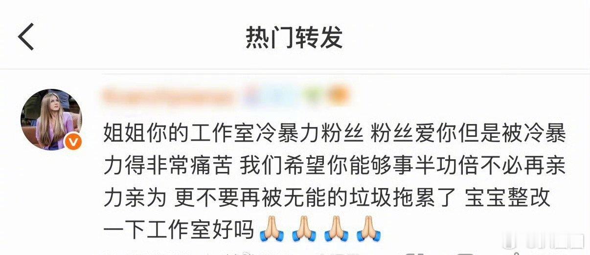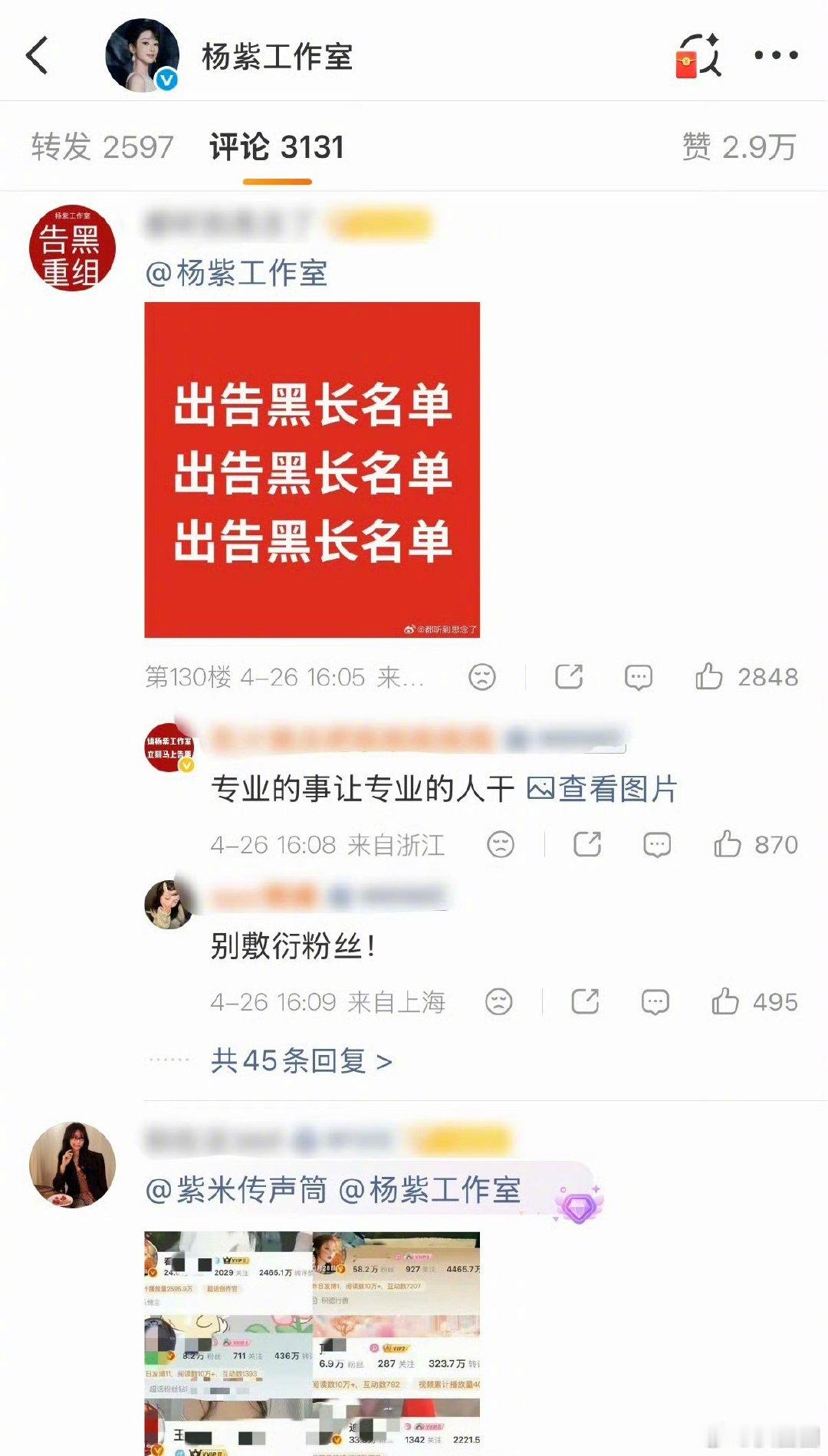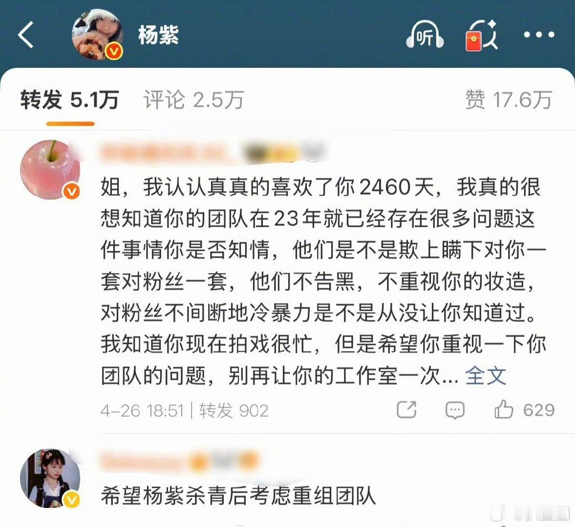 杨紫粉丝在杨紫微博留言要求重组工作室团队,说工作室却只会拖后腿,让杨紫帮帮粉丝~
