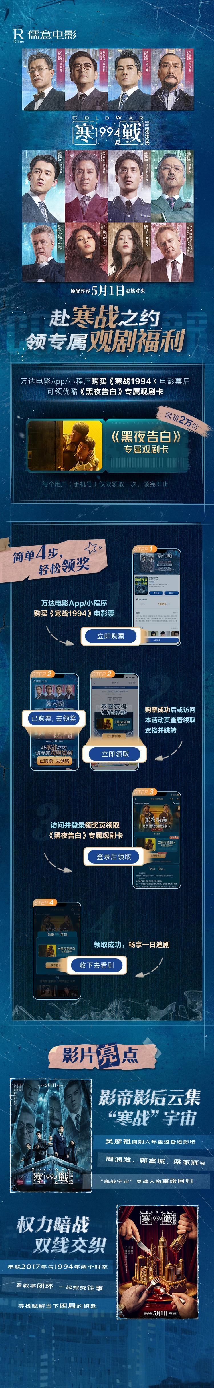 黑夜告白首播口碑 临近五一假期,儒意电影推出了两部重磅作品:剧集《黑夜告白》和电影《寒战1994》,与此同时也创新性的提出了“拼好片”模式。这个独家创新模式,打通了大小屏传统的固有框架,实现了线上线下共通。观众可直接通过儒意电影官方APP、小程序,自主完成城市点亮、同城拼场发起与参与等操作,实现观影需求的主导。