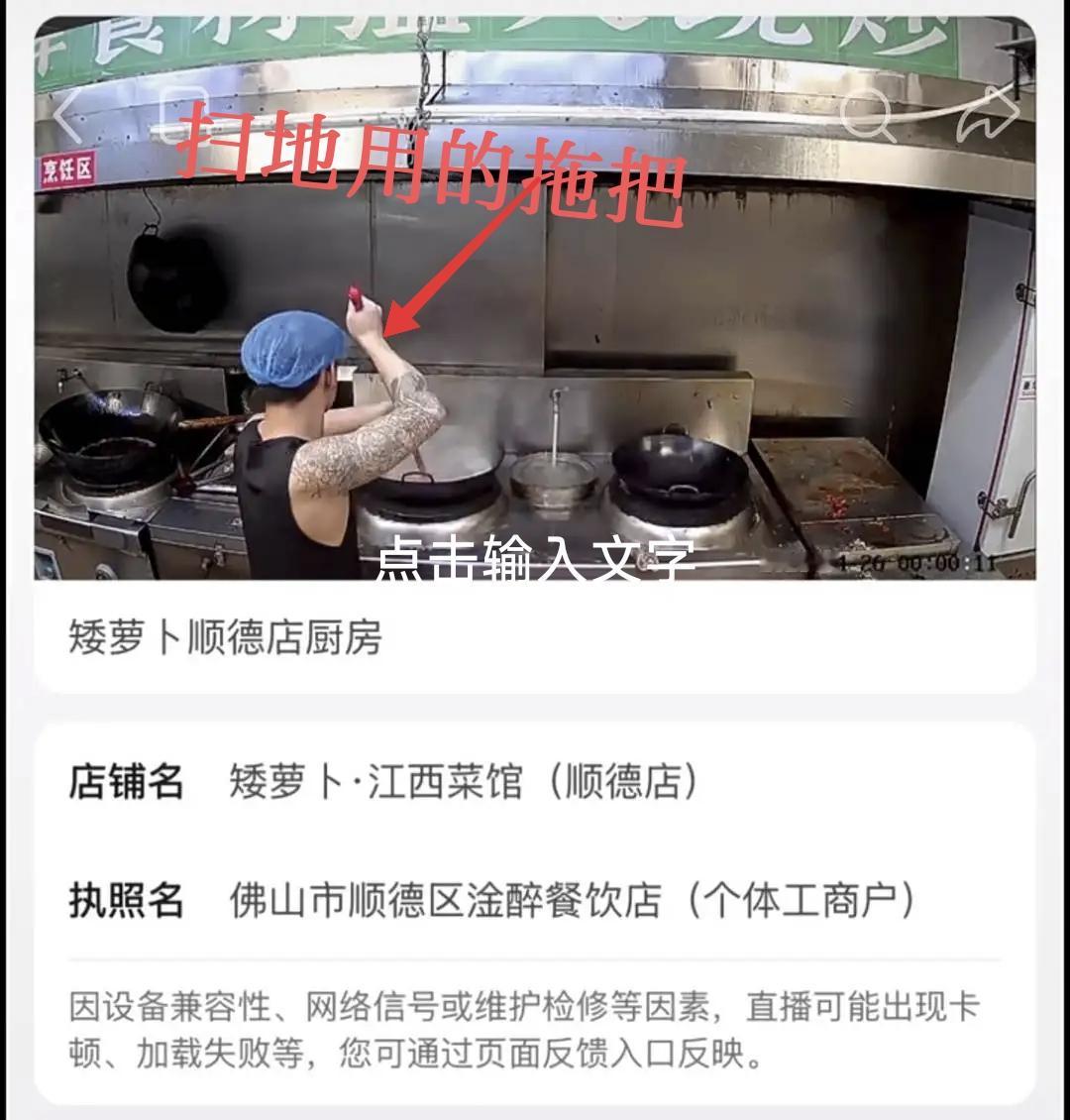 广东佛山那个向锅里吐口水的厨师,哪是什么油溅到嘴里了,这分明是干顺手了,习惯了! 根本就没把食客当人看。 4月24号晚上,点外卖的冯先生可能只是想看看我的菜做到哪一步了,就点开了外卖平台上的“明厨亮灶”后厨直播。 不看不知道,一看,这辈子的食欲估计都毁在这几秒里了。 后厨里一个右大臂有纹身的厨师,掌着勺呢,突然极其自然地朝着锅里就是一口口水。吐完面不改色心不跳,继续翻炒出餐。 这还没完,这位厨师大哥顺手拿起旁边的扫把,直接伸进炒菜的锅里涮洗。涮完扫把,接着用那口锅炒菜。而且这把扫把,前一秒还在扫灶台,后一秒就去刷地,最后再回到锅里“消毒”。 冯先生当场就打消了取餐念头。 店长的回应更是让人大开眼界。他承认有这事,但解释说:厨师说当时是油溅到嘴里了,吐口水是“本能反应”。 油溅嘴里,应该吐地上、吐垃圾桶、甚至吐水槽里,哪个正常人会精准地吐进正在炒菜的锅里? 更让人后背发凉的是,这后厨不止一家在用。同一间厨房,同时挂着“年轻20年·乡下菜馆”和“矮萝卜·江西菜馆”两块招牌,典型的共享厨房。也就是说,你在这家店点的菜,和那家店点的菜,很有可能出自同一个吐口水的厨师之手。 而出了这么恶劣的事,店长最后定性为——“厨德问题”。 这仅仅是厨德问题吗?这分明是食品安全事故,是蓄意污染食品的违法行为。把扫把放进锅里涮,用的还是店里“最脏的扫把”,这是对公共卫生底线的疯狂践踏。 处理结果是,两家店在外卖平台显示打烊了,店家说换了全部锅具,要整改。 但我想问的是,如果冯先生没打开那个直播呢?那锅带着口水的菜,是不是就进了某个不知情消费者的肚子?还有多少没有开通“明厨亮灶”的后厨里,正在发生着比这更不堪入目的事情? 这件事最让人无力的不是愤怒,而是后怕。今天我们靠一个偶然打开的摄像头抓到了一个吐口水的人,那明天呢? 食品安全,真的不能总靠消费者自己去当侦探。你以后还敢吃外面做的饭吗?