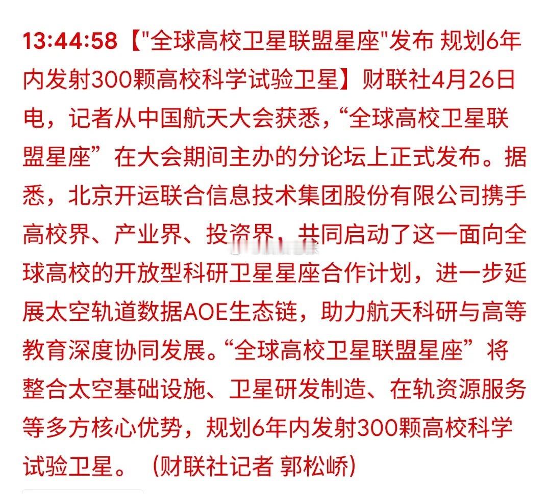 6年发射300颗卫星,全球高校星座横空出世,商业航天迎来史诗级利好财联社4月26日消息,“全球高校卫星联盟星座”在中国航天大会期间正式发布,规划6年内发射300颗高校科学试验卫星,由北京开运联合信息技术集团携手高校界、产业界、投资界共同启动。对股民而言,这是重大利好,标志着商业航天从政策驱动转向应用落地的关键跨越,将为全产业链带来确定性订单与技术迭代红利,中长期提升板块估值与业绩弹性。一、利好核心逻辑:三重价值共振,激活万亿太空经济1. 规模效应凸显:300颗卫星组网计划创造稳定需求,覆盖卫星制造、发射服务、地面站建设、数据运营全链条,直接拉动上下游企业营收增长。高校科研场景的特殊性,将催生低成本、高可靠性的标准化卫星平台需求,加速产业规模化降本。2. 技术迭代加速:高校科研与航天产业深度协同,形成“产学研用”闭环,推动星载芯片、轻量化结构、AI载荷等核心技术突破,提升国产替代率,增强产业链全球竞争力。科学试验卫星的高频发射,将为新技术提供在轨验证场景,缩短商业化周期。3. 应用生态扩容:延展太空轨道数据AOE生态链,催生教育、科研、遥感、通信等领域创新应用,打开商业航天盈利空间。高校星座将成为培养航天人才的“太空实验室”,为行业持续输送专业力量,夯实产业长期发展基础。二、产业链核心受益标的全解析卫星制造:国家队与民企双轮驱动中国卫星(600118)作为A股唯一具备卫星总体设计与制造能力的上市平台,民用小卫星市场市占率超70%,海南工厂年产能达1000颗,完全有能力承接高校星座批量订单。公司承担中国星网GW星座约60%研制任务,技术积累深厚,高校科学试验卫星的标准化需求将进一步提升其产能利用率与毛利率,同时通过与高校合作,加速新技术转化,巩固行业龙头地位。上海沪工(603131)旗下沪工卫星专注小卫星研发制造,具备“星箭一体化”服务能力,曾参与多颗科学试验卫星研制。高校星座对低成本、快速响应的卫星需求,与公司“敏捷制造”理念高度契合,有望获得批量订单,同时发射服务业务也将同步受益,形成“制造+发射”协同效应。发射服务:运力需求爆发,民营火箭迎来机遇星河动力(未上市)曾成功发射“开运一号”卫星,与北京开运联合有良好合作基础 。高校星座6年300颗卫星的发射需求,将为民营火箭企业提供稳定订单,加速其技术成熟与成本下降。相关受益上市公司包括:航天电子(600879)作为航天科技集团旗下火箭与卫星配套核心企业,为运载火箭提供控制系统、遥测系统等核心部件,发射需求增长将直接带动其配套业务营收提升。公司在箭上电子设备领域技术领先,国产化率高,将充分享受行业增长红利。核心部件:星载设备需求激增,细分龙头受益铖昌科技(001270)星载相控阵T/R芯片市占率超70%,技术壁垒突出,是卫星通信载荷核心供应商。高校科学试验卫星对通信、遥感等载荷需求旺盛,将为公司带来持续订单,同时高校科研合作有望推动芯片性能升级,拓展应用场景。上海瀚讯(300762)作为G60星链卫星通信载荷唯一供应商,载荷占卫星成本30%-40%,首批地面站已交付。高校星座的通信需求将直接拉动其载荷业务增长,同时地面站建设也将带来增量收入,公司技术优势将转化为市场份额与盈利能力。地面站与运营服务:数据价值凸显,运营端长期受益中国卫通(601698)作为国内唯一高轨卫星通信运营商,手握稀缺轨道与频率资源,低轨星座组网核心受益方。高校星座产生的海量科研数据,需要通过地面站接收与处理,公司地面站网络将发挥重要作用,同时数据运营服务有望成为新的盈利增长点,构建“卫星+地面+数据”全链条服务模式。中科星图(688568)作为航天数据可视化龙头,参与太空数据中心建设,为卫星数据提供处理、分析与应用服务。高校星座将产生大量科学试验数据,公司凭借技术优势,可提供定制化数据服务,助力高校科研,同时拓展商业航天数据应用市场,提升业绩弹性。软件与系统集成:北京开运联合合作方受益北京开运联合作为星座发起方,其合作伙伴将直接受益,包括:恒生电子(600570)为航天企业提供信息化系统解决方案,曾参与多个卫星项目管理系统建设。高校星座的复杂管理需求,将为公司带来系统集成订单,同时通过与开运联合合作,拓展商业航天信息化市场,提升业务多元化水平。三、风险提示1. 技术风险:卫星研制与发射存在不确定性,可能导致项目延期或成本超支。2. 竞争风险:商业航天领域参与者增多,可能引发价格战,压缩行业利润空间。3. 政策风险:航天产业受政策影响较大,相关法规变化可能影响项目推进。