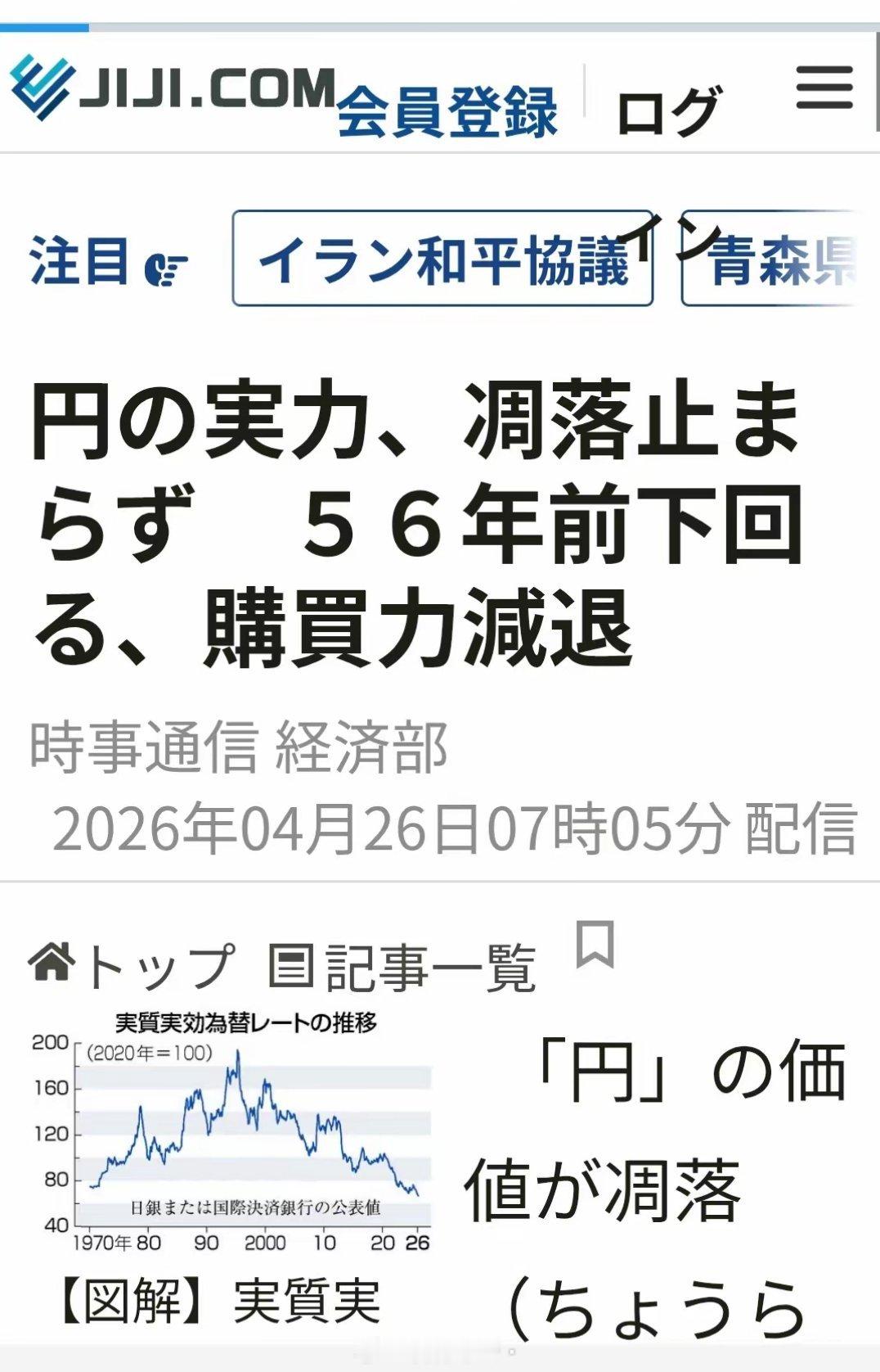 日本时事社:由于日元贬值刹不住,日元的购买力已经跌到了56年前的1970年代水平。日本购入原材料的价格疯长。所以到底是谁在崩溃?