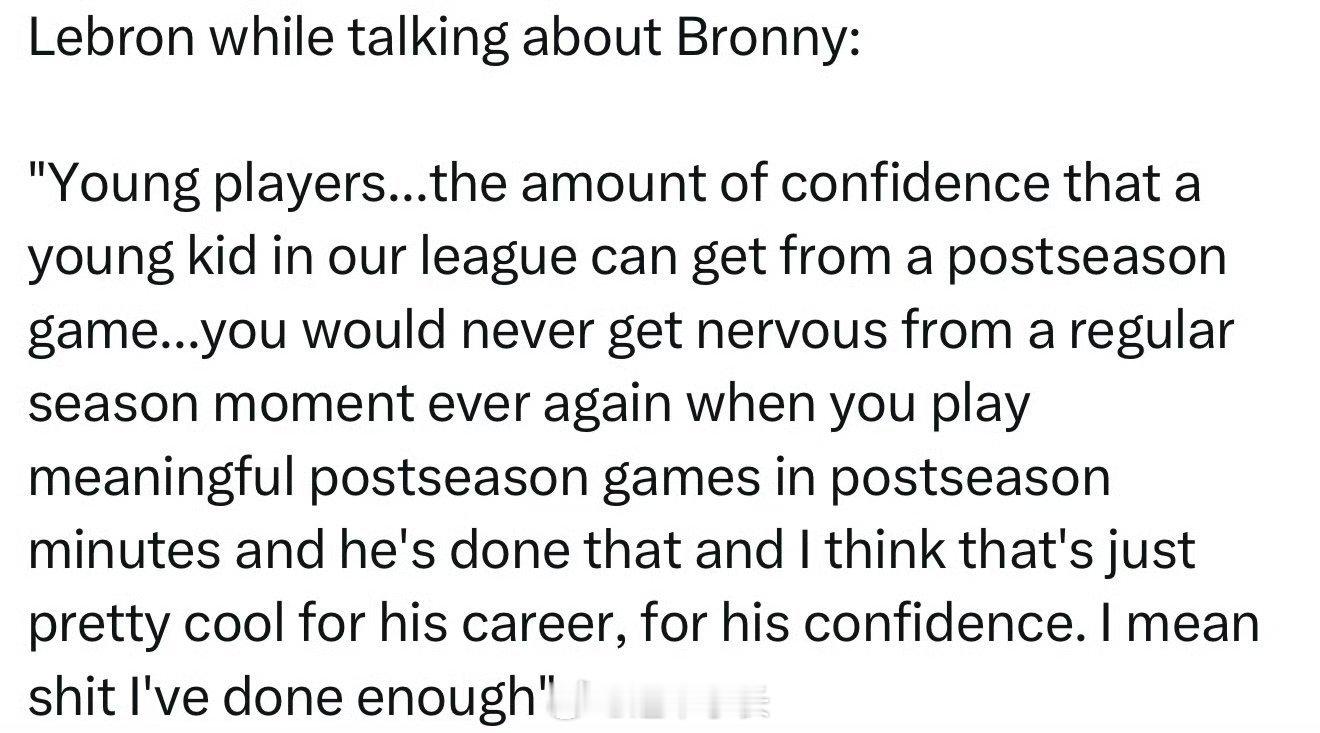 “年轻球员……一个联盟里的年轻孩子能从一场季后赛比赛中汲取多少信心……当你在季后赛的重要时刻、重要的上场时间里打球,你就再也不会因为常规赛的某个时刻而紧张了。他已经做到了这一点,我觉得这对于他的职业生涯、对他的自信心来说,都非常酷。我的意思是,靠,反正我已经做得够多了。”