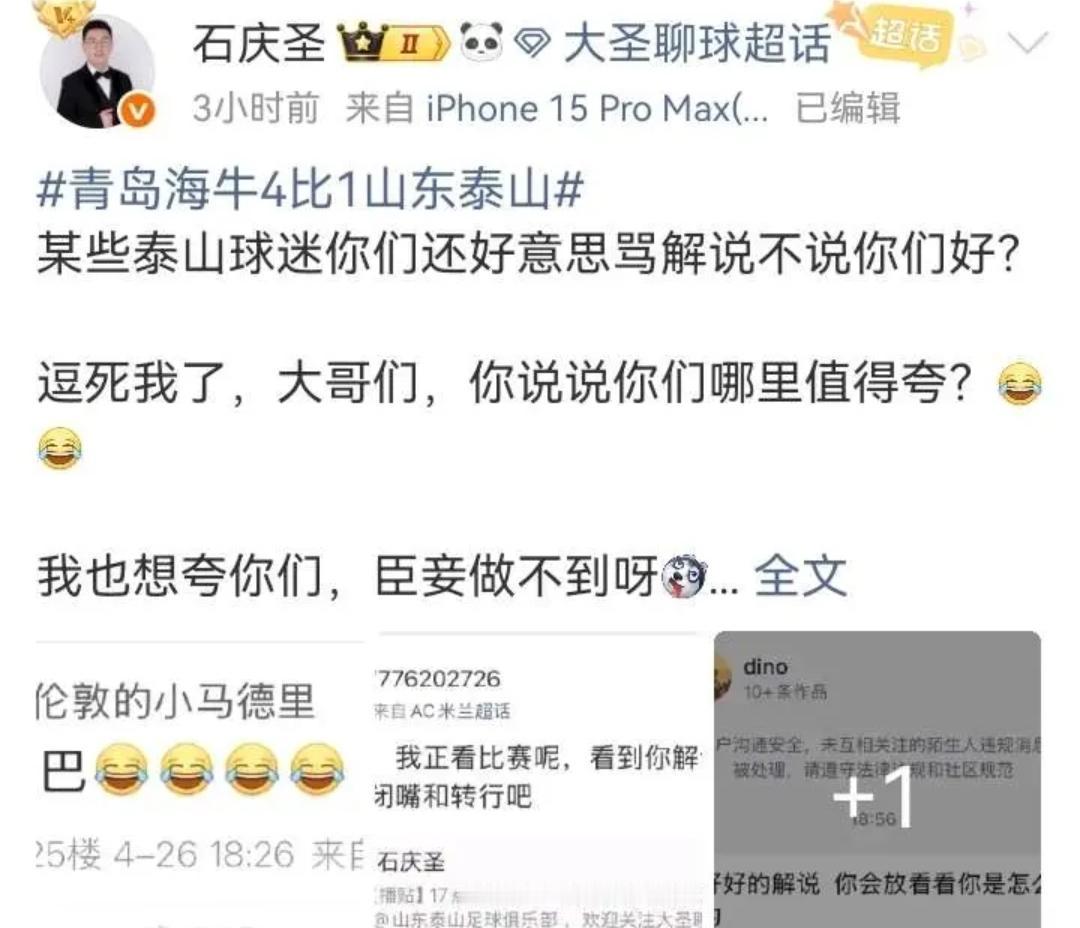 有些泰山球迷真的是非蠢即坏!怎么想的呀,去社媒“围攻”比赛解说员,关键还听不懂好赖话,太容易被带节奏了。 本场比赛1-4输给了青岛海牛,让泰山球迷感到无比的愤怒,或许是需要宣泄输球带来的怒火,又或许是对解说员本身的解说风格和用语不满,许多泰山球迷跑到解说员社媒去“围攻”指责。 但这真的对吗?显然不对。确实解说员在解说比赛的过程中,对几位泰山球员用词较为严格,对球队也有不少的批评,但这些都是球队和球员真实的表现,常言道挨打要立正,球迷可以去维护,但不能无脑维护。 而且解说员本身就是山东人,也是山东泰山的球迷,他在解说的过程中,更多的是以一种恨铁不成钢的心态去批评球员表现不佳,而不是单纯的刻意针对球队和抹黑球员。