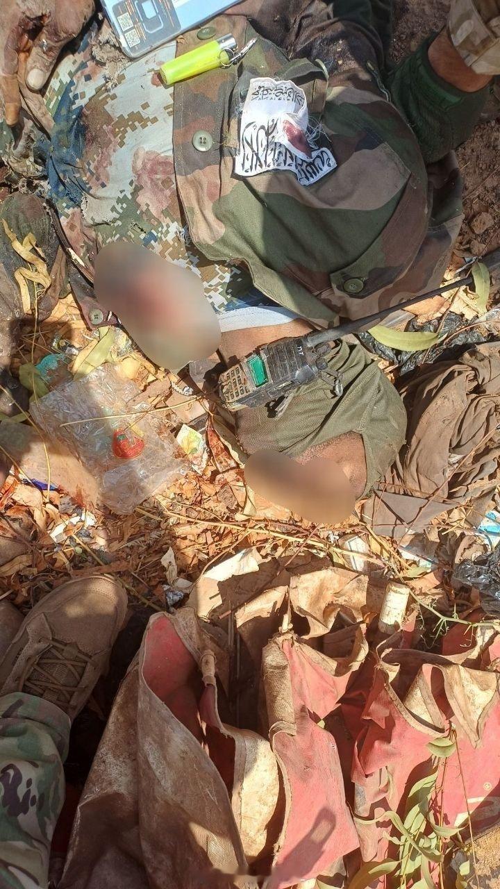 俄罗斯非洲军团新发布了一批在马里作战的照片,展示了一些被打死了的JNIM/FLA武装分子的尸体,以及缴获的两辆自爆车和武器弹药。