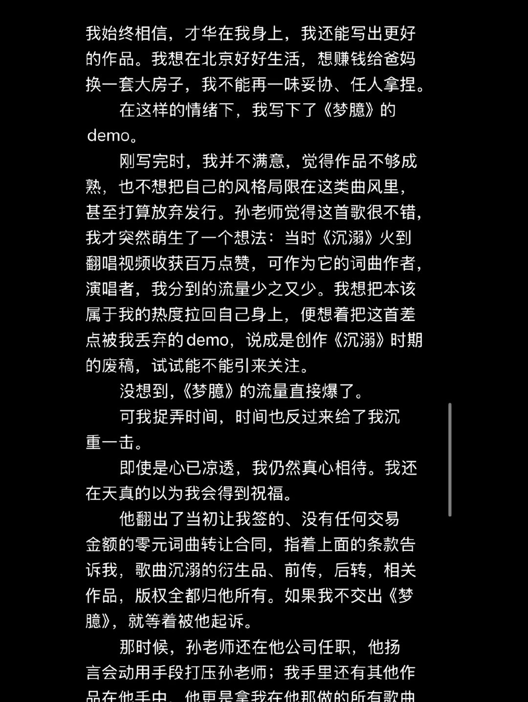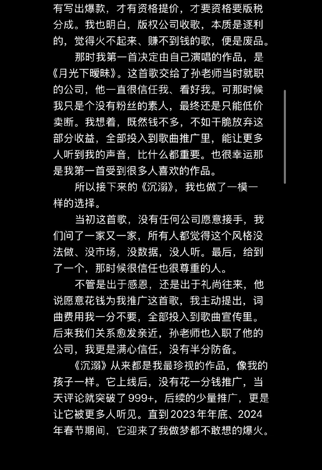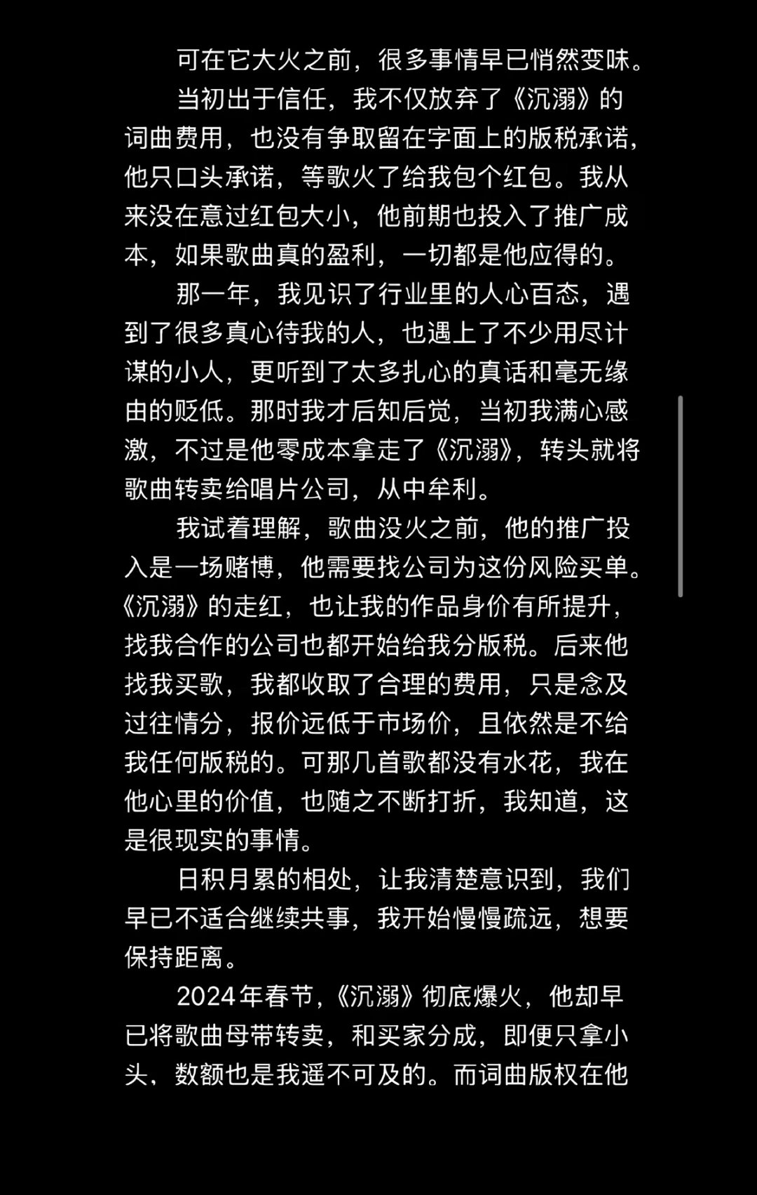【邹沛沛长文控诉版权方 】邹沛沛曾因版权被威胁 4月26日晚,邹沛沛在长文中回应了《沉溺》的版权归属问题:她2021年入行时是新人,为维持生计曾低价卖断作品,《沉溺》因无人看好推广前景,她最后出于信任将词曲免费交给一位行业前辈推广,未签署任何书面版税协议,仅得到“歌火了给红包”的口头承诺。邹沛沛回应沉溺版权