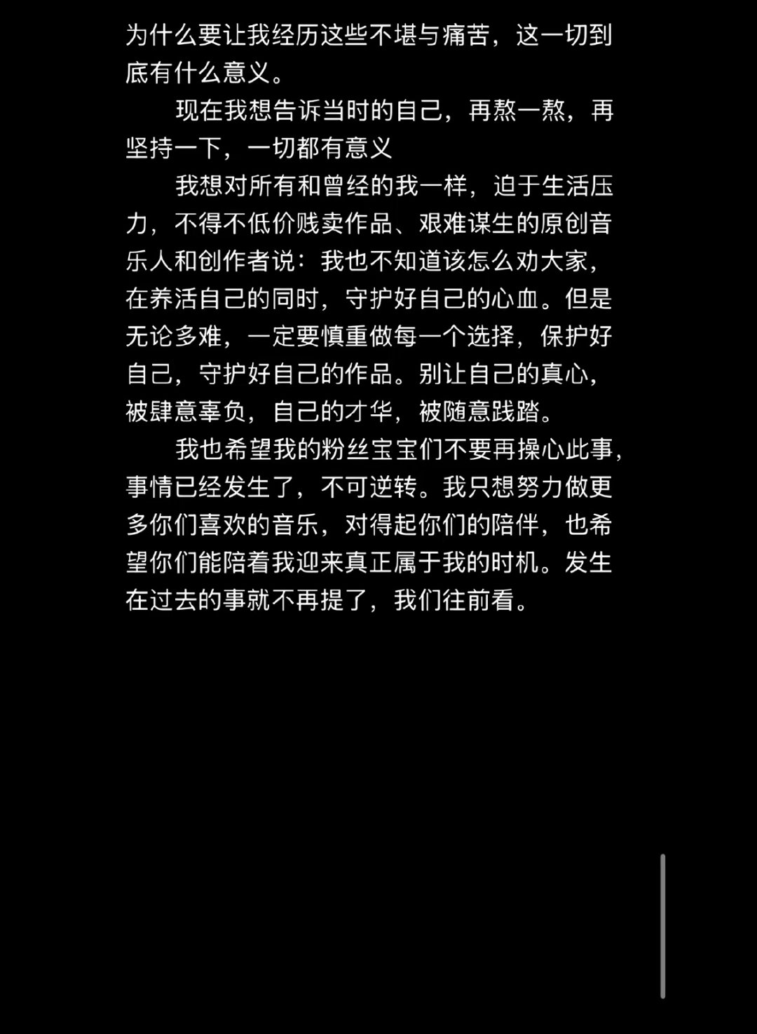 邹沛沛坦言已无法收回《沉溺》版权,只能向前看,同时呼吁所有原创音乐人,一定要重视版权合同,保护好自己的作品与心血,不要因信任放弃合法权益。