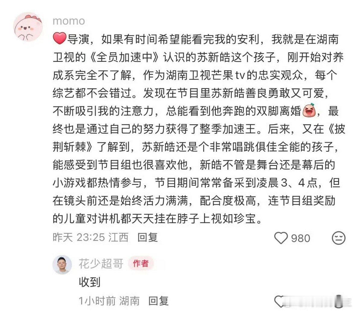 花少总导演回复苏新皓粉丝有花少7珠玉在前,花少8真的好抢手花少的导演这段时间回复了多少家自荐的粉丝