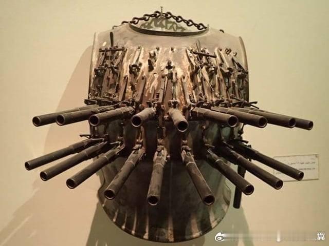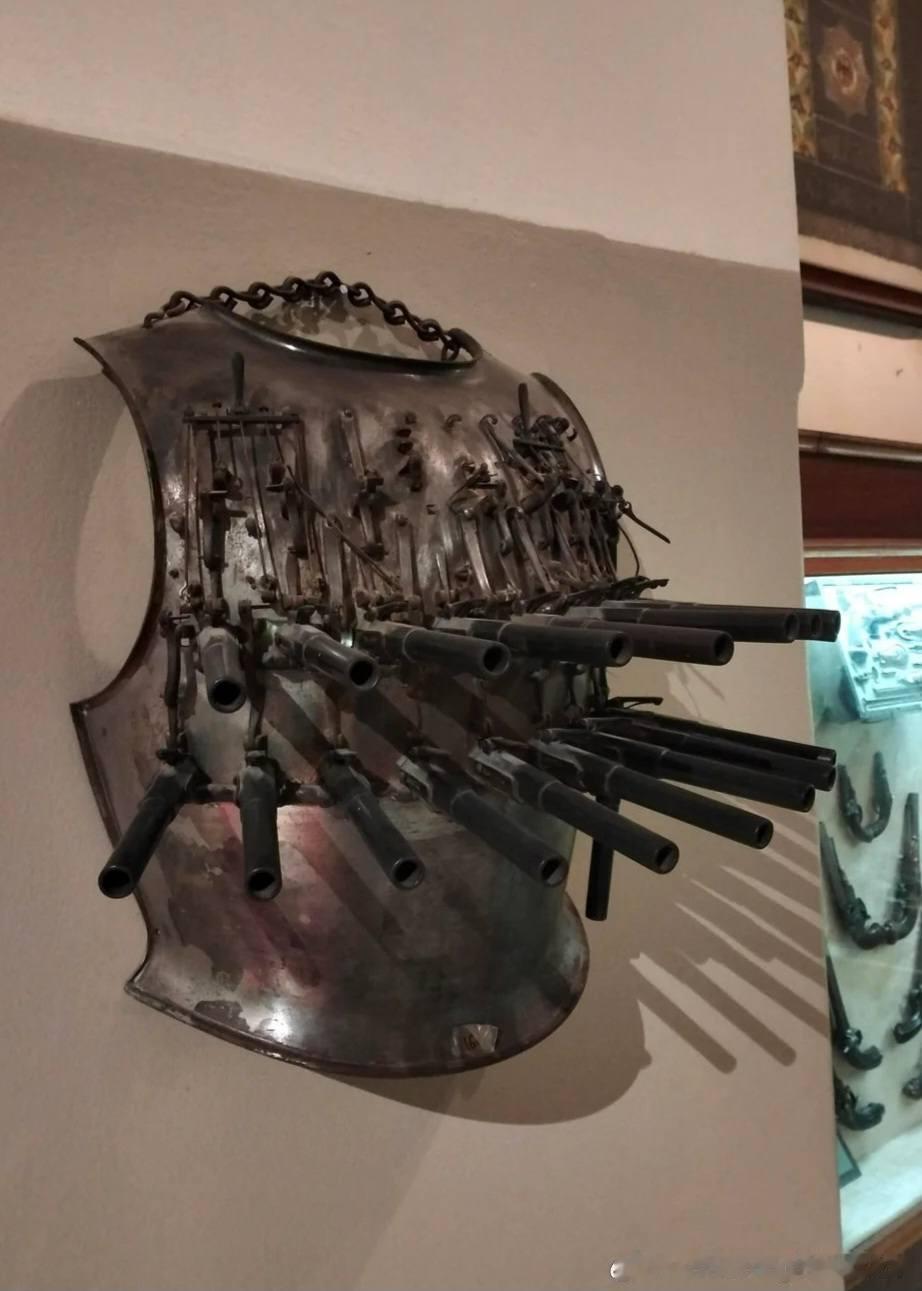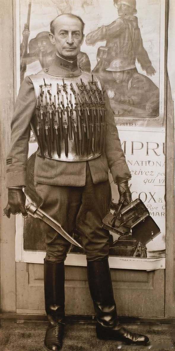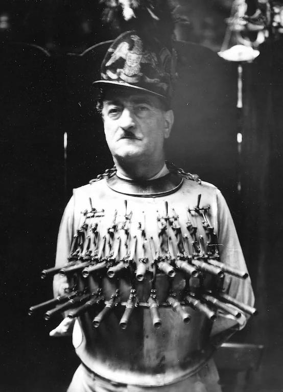 他最引人注目的装束是身上这件独特的手枪胸甲(Pistol Cuirass):这件胸甲重约13.6 公斤,上面装有19支单发手枪。