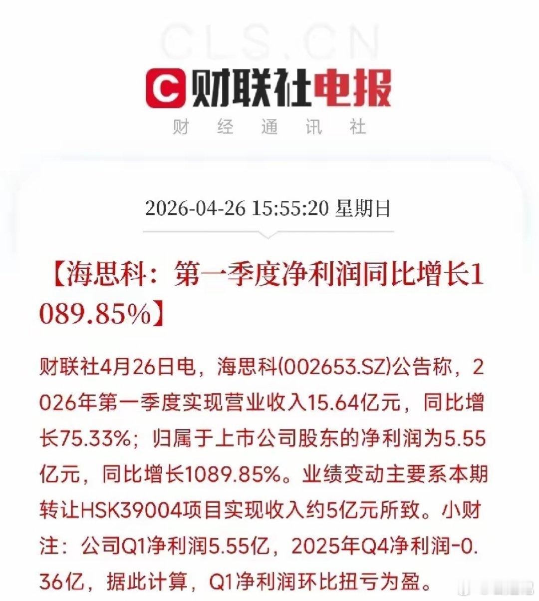 一季报净利大增1089%!海思科这份成绩单,藏着创新药企最性感的商业模式今天,海思科披露了一季度成绩单。Q1营收15.64亿元,同比增长75.33%;归母净利润5.55亿元,同比大增1089.85%。一个季度赚了去年全年两倍还多。单看数字,这是2026年一季报里炸裂程度比较高的一份成绩单。业绩变动主要系本期转让HSK39004项目实现收入约5亿元所致。很多人看到这里就关掉了——“哦,卖项目换利润,没意思。”但如果只看到这一层,你错过的可能是创新药企商业模式深刻的变革。这份成绩单不是一份简单的财报,而是一张转型成绩单,它告诉你,创新药的游戏规则,已经变了。第一层:剥掉5亿一次性收益,主业到底怎么样?先把那笔5亿的项目权益转让收入剥掉。剩下的、来自日常经营的真实利润,大约在5000万元左右。相比去年同期的约4700万元,其实只是持平或微增——是的,扣掉那笔横财,主业利润基本没涨。但这份没涨里,藏着一个重要的结构性变化。2025年,海思科研发费用同比大增29%,创新药研发投入持续加码,这些投入在当期全部费用化,直接侵蚀利润。在这种负重前行的背景下,主业利润依然扛住没有下滑,靠的是什么?是已上市创新药的快速放量:环泊酚、思美宁、倍长平、思舒静四款创新药,2025年销售收入同比增长超50%,环泊酚稳居国内静脉麻醉药市场份额龙头,美国NDA申请已获FDA受理,预计Q2获批上市。先有创新药销售基本盘扛住巨额研发投入,才有资格谈后面的故事。第二层:5亿一次性收入,背后是什么模式?HSK39004是海思科自主研发的一款呼吸系统创新药,公司把这个药在海外市场的权益,卖给了由Frazier、奥博资本等顶尖基金孵化的NewCo公司AirNexis,仅首付款就确认了4000万美元,折合人民币约5亿元。你以为这就完了?就在一季度业绩预告发布之前,海思科还官宣了一笔更大的:把另一款潜在First-in-class的镇痛新药Nav1.8抑制剂的海外权益,卖给了国际制药巨头艾伯维,首付款3000万美元,未来里程碑付款最高可达7.15亿美元,加上HSK39004项目交易,两笔BD交易总金额超过50亿元人民币。这已经不是卖项目,而是一种可持续的商业模式——“自主研发、阶段性授权、滚动变现”。研发靠销售基本盘输血,授权靠管线价值爆发,两者形成闭环。创新药企可以不再只依赖卖药赚钱的单一模式,而是可以像科技公司一样,通过“自主研发→授权BD→滚动变现”实现价值释放。四笔BD交易落地,两笔买方是艾伯维这类顶级MNC,证明其研发能力已经得到国际制药巨头和顶尖基金的信用背书。第三层:清醒清单。第一,BD收入确认的节奏完全不可控。那些“最高7.15亿美元”的里程碑付款,是绑定在临床进展、审批节点、销售目标上的对赌条款,不是签了合同就能确认收入。第二,环泊酚美国获批是利好,但落地仍有变数。2025年7月FDA已受理其全麻诱导适应症的NDA申请,目前处于审评阶段,预计26年Q2有望获批上市。不过当前中美关税政策持续变动,关税变化或将影响创新药出海的经济模型。第三,估值不算便宜。当前股价对应2026年传统主营利润的PE仍在较高位置,市场已经包含了对后续BD持续落地的部分预期,如果后续BD断档,估值承压是必然的。Q1的5亿首付款,是飞轮转起来之后掉下来的第一块金砖。接下来市场要看的,不是这块金砖有多重,而是这个飞轮还能转出
