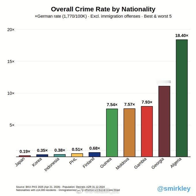 德国政府发布的2025年犯罪数据显示,外籍移民的犯罪率依然显著高于德国公民。但具体到国籍上存在较大差异,阿尔及利亚、格鲁吉亚、冈比亚、摩尔多瓦和几内亚人的犯罪率比德国人高出几倍甚至十几倍,但亚洲人(日本人、韩国人、印尼人、菲律宾人)和芬兰人的犯罪率反而比德国人低很多。