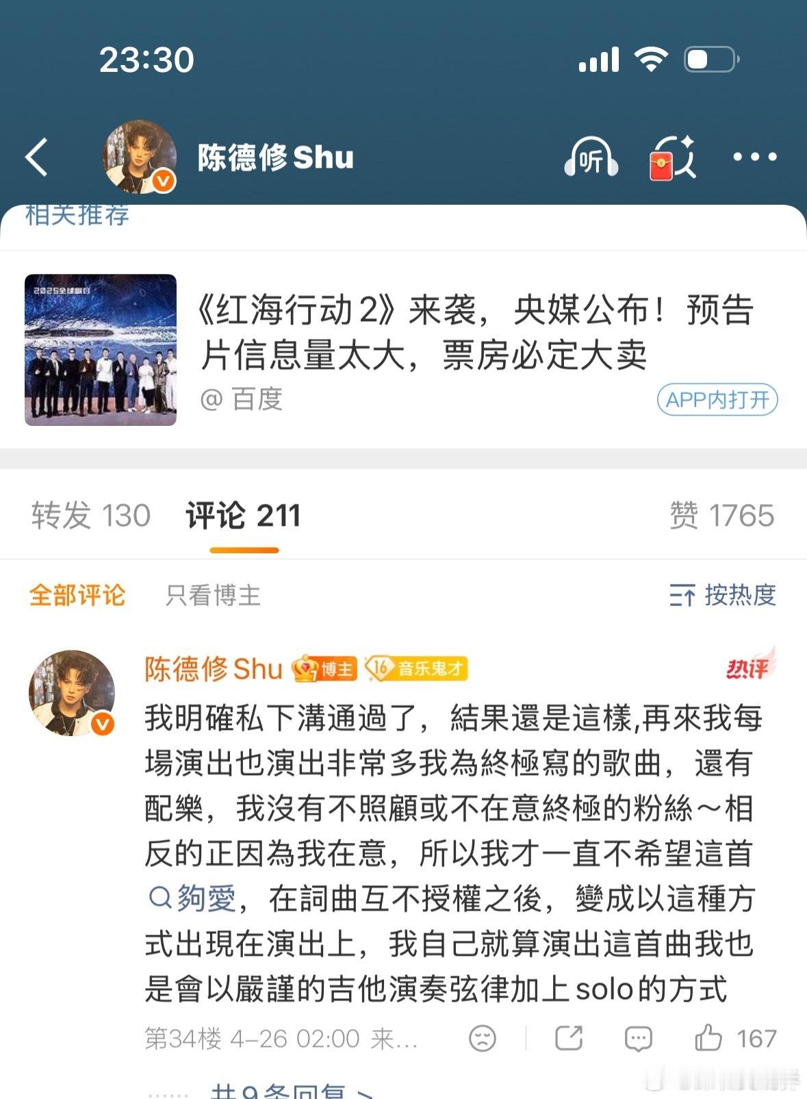 结果没过多久,陈乃荣和黄少谷在演出中合唱《够爱》,全场大合唱勾起无数终极回忆杀,陈德修却突然发文,明确表示不希望再有人拿《够爱》的曲子,在演出中搭配任何歌词,也不让现场观众演唱。