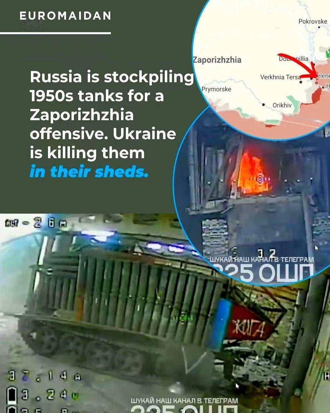 一辆70多岁的老古董T-55坦克,从生锈的仓库里被拖了出来,引擎轰鸣着开向扎波罗热。 车里的士兵以为这是他们的“移动炮台”,是步兵的救星。 他们不知道的是,一公里外,一架巴掌大的无人机,已经透过树林的缝隙,死死盯住了它的顶盖。 这批上世纪50年代的钢铁疙瘩,根本不是用来搞什么装甲冲锋的。它们的唯一任务,就是慢吞吞地跟在步兵小队后面,哪儿有火力点,它就扭过炮塔来一发。 对于趴在散兵坑里的士兵来说,这东西的引擎声,就是安全感。 但战场变了。 乌军的无人机操作员就像幽灵,他们不找人,不看战壕,专门钻各种库房、车棚,或者用热成像扫过每一片可疑的树林。 屏幕上,一辆盖着伪装网的T-55轮廓刚刚出现,操作员的嘴角就微微动了一下。 他轻轻推了一下摇杆,屏幕里的那个小黑点,就带着尖锐的啸叫声,垂直扎向那个毫无察觉的铁盒子。 一声闷响。 刚才还跟在坦克旁边的俄军步兵,瞬间趴倒在地,扭头看向身后,那台移动炮台已经变成了一团冒着黑烟的废铁。 前一秒还是火力支援,后一秒就成了火力吸引器。 所以说,现代战争里最残酷的不是武器换代,而是用上一代的士兵,去开上上上一代的装备。
