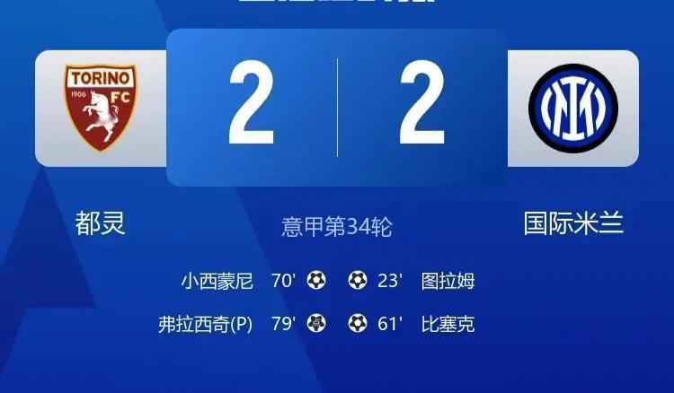 【意甲34轮,都灵2-2国际米兰,九分钟连追两球,国际米兰10分领跑】意甲联赛,裁判丑闻再度爆发,司法机关介入,大概是更高层面反思三次不进世界杯的根源了。 2026-04-27 00:00,北京时间,都灵奥林匹克球场,国米2-0领先,都灵9分钟连追2球扳平,国米仍10分领跑意甲。国际米兰球员表现很好,没必要追求这一轮就完全解决问题。 ⚽ 一场平局,都灵展现韧劲 23分钟 0-1,迪马尔科左路传中,小图拉姆头球破门,这是他国米生涯50球。 61分钟 0-2,迪马尔科角球助攻,比塞克头球扩大比分。 70分钟 1-2,伊尔汗助攻,小西蒙尼单刀挑射破门。 79分钟 2-2,奥古斯托禁区手球送点,弗拉西奇点射扳平。 ✨ 关键人物 迪马尔科,双助攻,赛季意甲18次助攻,创意甲单赛季历史纪录。小图拉姆,国米生涯50球里程碑。都灵反击组,小西蒙尼+弗拉西奇,9分钟内完成逆转级扳平。 📊 全场数据(都灵→国米) 控球率,37% → 63%,国际米兰在客场,表现出十足的优势。 🏆 联赛形势 此役过后,国际米兰积79分,领先第二名10分,意甲冠军大局已定。