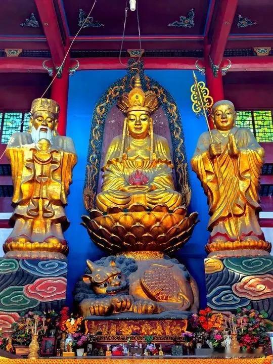 九华山地藏三尊像里,藏着一个让人心软的故事 站在这尊像前,最先看懂的,不是菩萨的威严,而是两边这对“反着来”的父子。 中间端坐的是地藏菩萨,身下的谛听伏在莲花座前,金光裹着慈悲,眉眼间全是护佑众生的温柔。可有意思的是他身边的两位胁侍:右边持锡杖的是儿子道明,左边白须垂胸的是父亲闵公。明明是父子,儿子却站得更靠前,成了父亲的师兄。 当年闵公是九华山的大施主,把整座山都捐给了金地藏建寺。儿子道明跟着出家,先一步成了菩萨的弟子。后来闵公也看破红尘,皈依佛门,却只能做了儿子的师弟。佛门不讲俗世辈分,只论修行先后,这一幕,倒成了九华山上最动人的一段佳话。 地藏菩萨发下“地狱不空,誓不成佛”的大愿,可这尊像里,最戳人的,却是这对父子放下尘俗、一心向佛的柔软。来九华山的人,大多带着心事,站在这里看一眼,仿佛也懂了几分“放下”的意思。🙏 佛教圣地 九华山 大佛地藏王菩萨