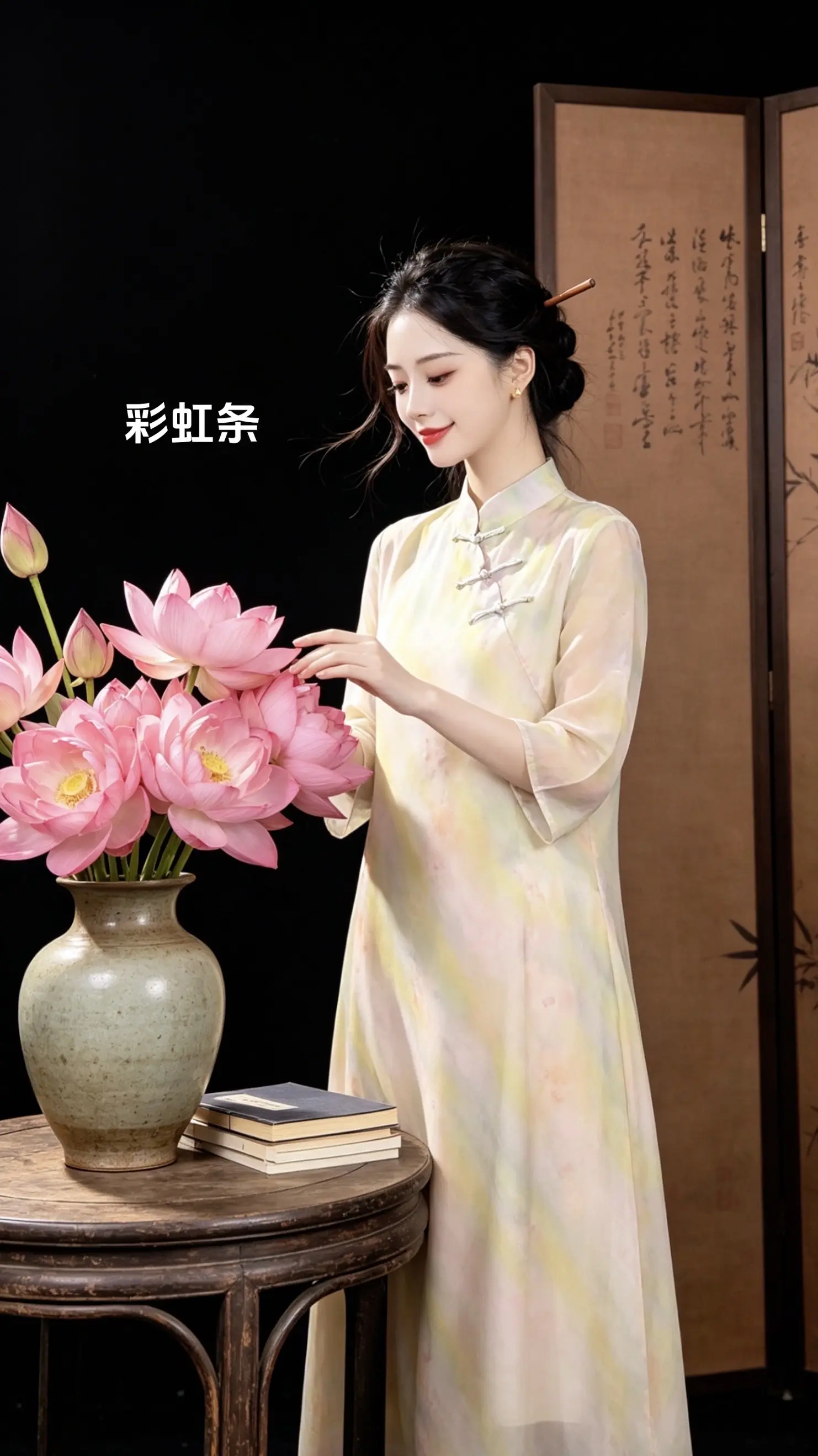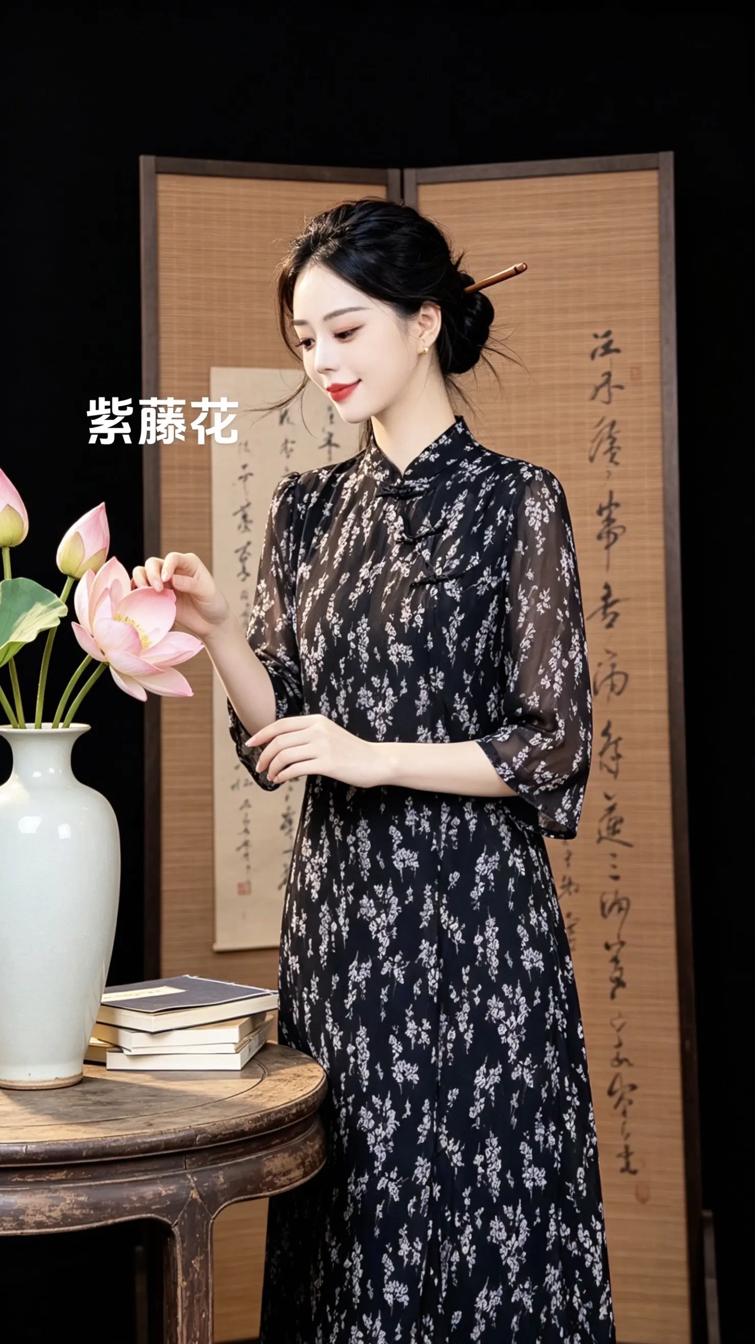 女子身着暗纹繁复华丽的精致锦绣旗袍,乌黑微卷长发披肩,身姿婀娜娉婷袅娜,肌肤无瑕