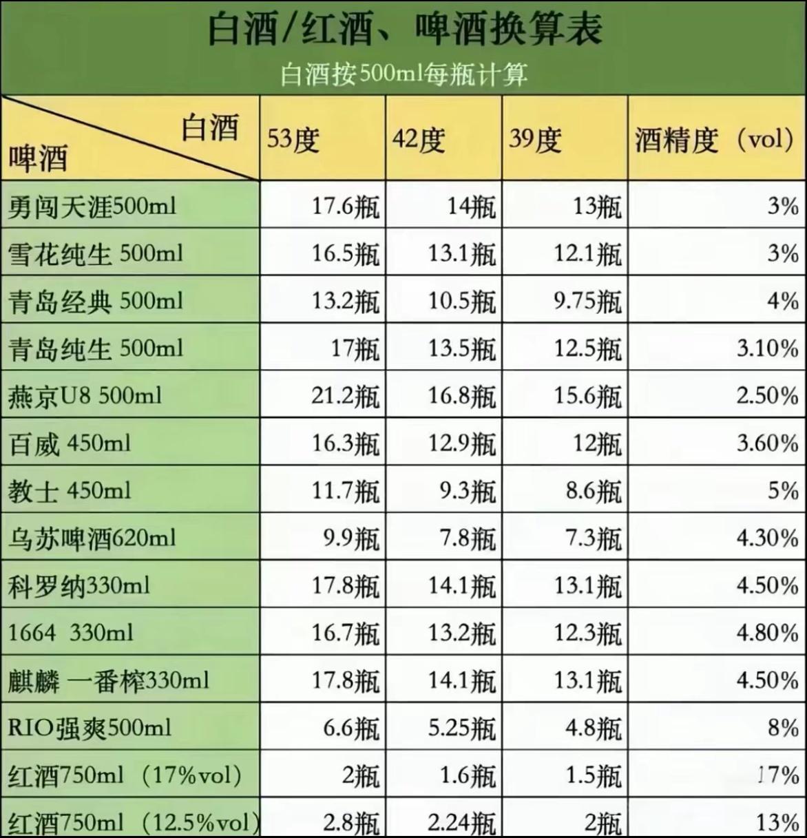 我朋友总说:你们喝一杯白酒,我喝两瓶啤酒,谁也不吃亏!直到看到这张换算表才知道。一瓶53度白酒,顶得上近20瓶普通啤酒,他说的“两瓶”,连零头都不够!别再被喝啤酒的骗了,真正的“海量”,算完酒精量才知道!酒量计算