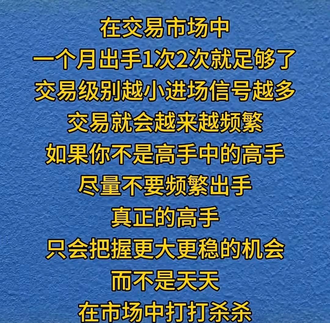 在交易市场中,一个月出手一次两次就足够了,交易级别越小,进场信号越多,交易就会越来越频繁,如果你不是高手中的高手,尽量不要频繁出手,真正的高手只会把握更大更稳的机会,而不是天天在市场中打打杀杀。多么痛的领悟呀。