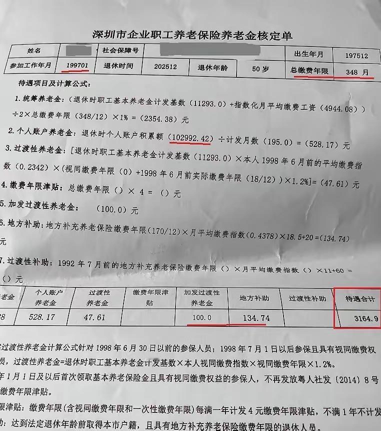 还是深圳市的企业职工养老保险养老金核定单最让人安心了:因为它的待遇项目和计算方法以及计算过程清楚明白一目了然,根本不需要费脑去寻思这养老待遇是怎么算出来的。 且看这份养老金和核定情况:这位女职工,1975年12月出生,2025年12月年满50岁正常退休。1997年七7月参加工作,总计缴费年限348个月。 她的养老金有7个项目组成: 1、统筹养老金,计算方式跟别的省份相同,她这一项获得¥2354.38; 2、个人账户养老金,多交多得少交少得的原则,她100,000多点的个人账户累积平均分配在195个月里,每月可得¥528.17; 3、过渡性养老金,她参加工作太晚了,尽管她所在地的计发基数高达¥11,293,她这一项自然获得¥47.61; 4、缴费年限津贴为零; 5、加发过渡性养老金,每月¥100; 6、地方补助这一下可获¥134.74; 7、过渡性补助这一项为零。 她的养老待遇合计¥3164.9。 到底是特区,感觉深圳的养老待遇真不错。50岁就拿养老待遇的女性相当年轻,深圳的就业机会又很好,只要身体好又勤劳肯干,完全可以另谋职业再干几年增加自己的养老保障。祝贺退休,养老无忧!