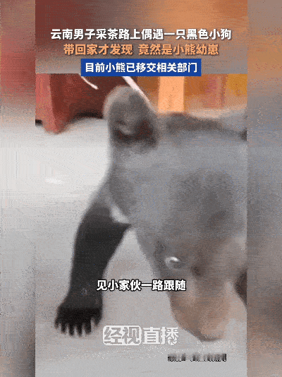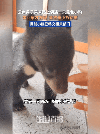 离谱!云南大哥捡回一只流浪狗,半夜喂牛奶愣住:这竟是熊崽子! 离谱又暖心!云南勐腊这位李大哥,傍晚在林间小道捡回一只黑乎乎的小家伙,本以为是只没人要的流浪狗崽,满心欢喜带回家准备好生喂养。可夜里给它喂牛奶时,瞅着小家伙啃爪子的模样,当场直接愣住——这压根不是小狗,分明是一只黑熊幼崽! 4月22号傍晚,勐腊的李大哥背着茶篓往家走,林间小道上窜出个黑绒绒的小家伙,也就巴掌大,蹲在路中间直哼哼。 李大哥低头一看,小家伙浑身沾着草籽,小尾巴跟个小毛笔似的摇来摇去,八成是被母狗遗弃的小狗崽。他心一软,解下腰间的布袋把小家伙装进去,一路念叨着回家给它煮肉粥,打算好好收留这个小可怜。 到家刚把小家伙安置在旧棉絮上,李大哥立马就犯了嘀咕:这“小狗”的爪子怎么比猫爪还宽?凑近仔细端详,圆滚滚的脑门上立着两只小耳朵,神态样貌越看越不对劲。 他赶紧拿出手机搜索黑熊幼崽图片,对比到第三张时瞬间惊住:这哪里是狗,分明是野生小熊崽! 不得不说李大哥特别沉稳,哪怕心里又惊又慌,还是先找来透气竹筐把小家伙妥善安置,避免误伤。紧接着立刻拨通林业部门电话,紧张得说话都有些结巴:“同志,我家里捡了个‘熊孩子’,你们赶紧过来看看!” 没过两个小时,工作人员携带专业装备火速赶到现场。打开竹筐那一刻,小家伙“嗷”地叫了一声,肉乎乎的小爪子扒着筐沿往外探,呆萌憨趣的模样,把在场所有人都逗乐了。 工作人员介绍,这是一只野生黑熊幼崽,应该是和母熊意外走散,流落林间。万幸遇上善良又有分寸的李大哥,没有私自饲养,及时求助专业人员,给了小家伙最好的安置。 生活中遇到这类迷路的野生动物幼崽,心软想帮忙可以理解,但千万不能一时冲动就带回家收养。野生动物有自身的生存习性和自然规律,私自收留不仅容易触犯法律,还会影响它们回归自然,反而好心办了坏事。 像李大哥这样,发现身份不对立马报备相关部门,理智处理、科学救助,既有爱心又守规矩,满满的大智慧! 换作是你,在路上偶遇这种毛茸茸的陌生小家伙,第一时间会怎么做?欢迎评论区聊聊你的真实想法。 为善良靠谱的云南李大哥点赞转发,让更多人了解野生动物的正确救助方式! 云南大哥捡熊崽秒变求助现场 暖心举动藏着大智慧 野生动物保护那些事 信息来源:经视直播。 图片来源:长江云新闻、经视直播,如有侵权,请联系删除。