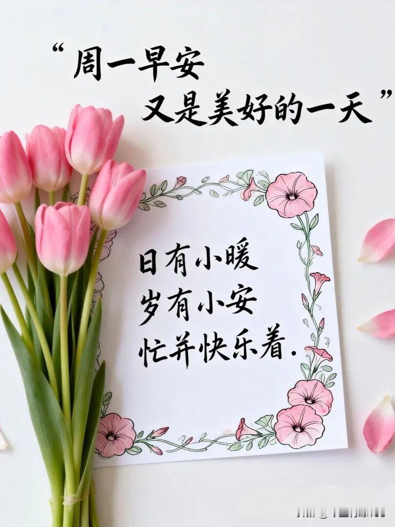 新的一周开始了,大家早安吉祥 晨光温柔洒下来,春风轻轻拂脸庞,新的一天,如诗如画般开启。 愿你心怀暖阳,所有不快都随风散去,美好总会如约而至。 春日清晨藏着无限美好,愿你带着希望启程,脚下都是顺遂路。 揣着感恩前行,时光不负努力者,定会送你满程收获。 春意正浓的清晨,愿生活多些温柔,日子平安顺遂,万事皆安!