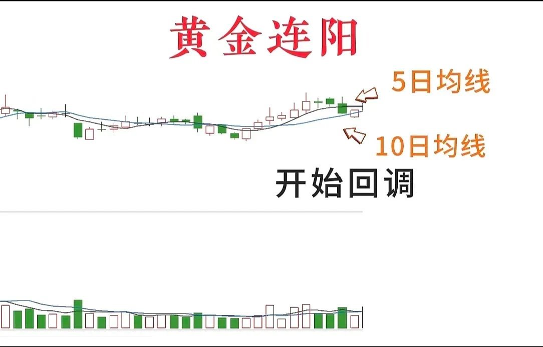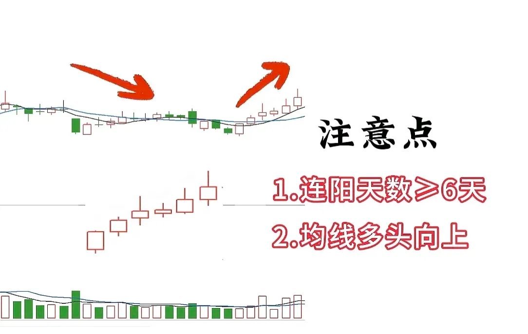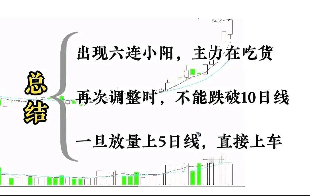 股票如果出现六连阳盯好这两个信号轻松吃肉当你手中持有一只一直横盘的股票突然出现了连续几天小阳线,你会怎么办?是继续持股还是逢高出局?首先我们从前面可以看到这只股票一直是横盘震荡整理,再出现连续小阳,量能也是小幅放大,这里有两个注意点,第一连阳天数不能少于6天,为;第二是均线趋势向下转为向上多头排列,出现六连小阳,代表主力在偷偷吃货,而均线向上说明控盘力度变强,像这种走势,称之为黄金连阳形态,后期拉升概率极大,必须加入自选股重点关注。那么问题来了,我们该在何时进场?你只需要记住两大信号,一、连阳黄金线出现以后,股价开始回调,可以跌破5日均线,但不能跌破10日均线,;二、回调过程中只要出现一根放量阳线,同时站上了5日均线,此时就是上车信号。我们果断进场,随后迎来主升大涨。股票