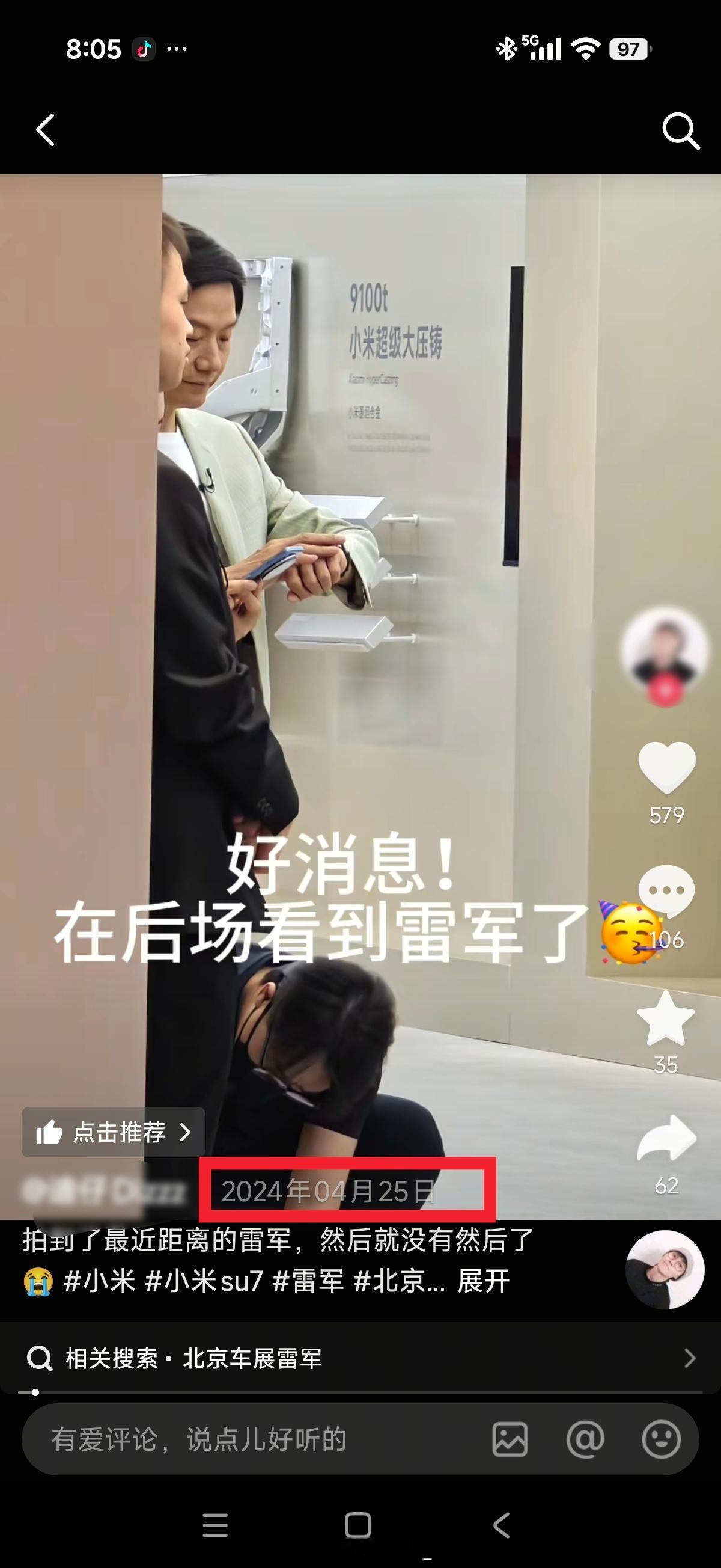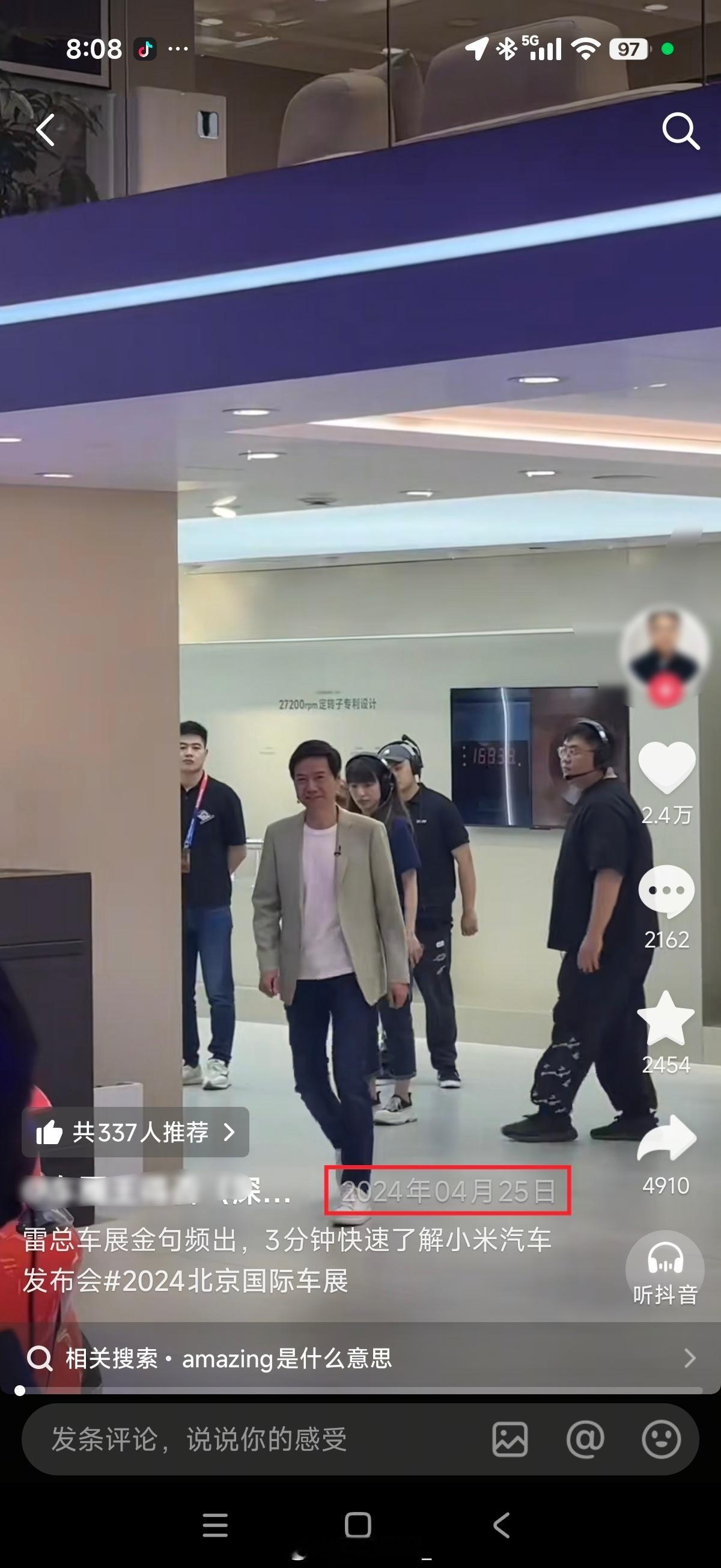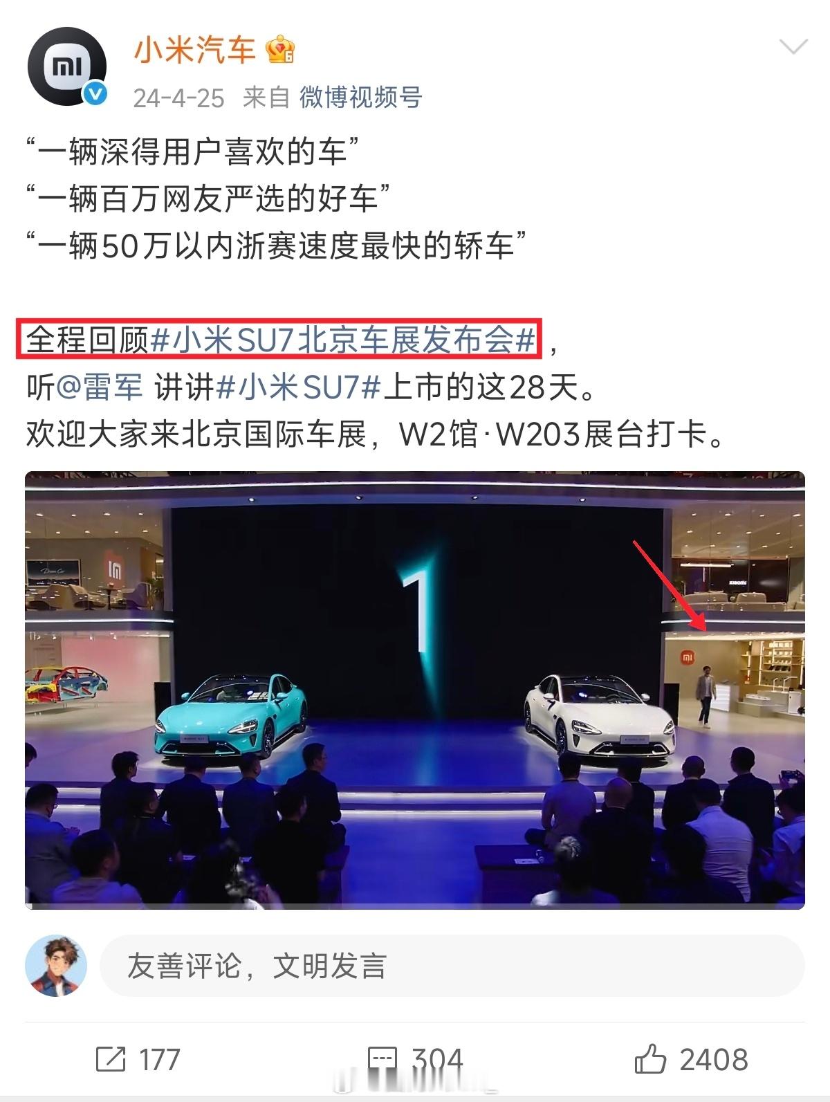 这是我找到的博主发的现场视频,(图1)正是全网流传的此截图来源处。这张被全网疯传的照片,是2024年北京车展小米SU7发布会现场的一张错位抓拍,却被别有用心的人恶意解读、二次加工,用来抹黑雷军形象。