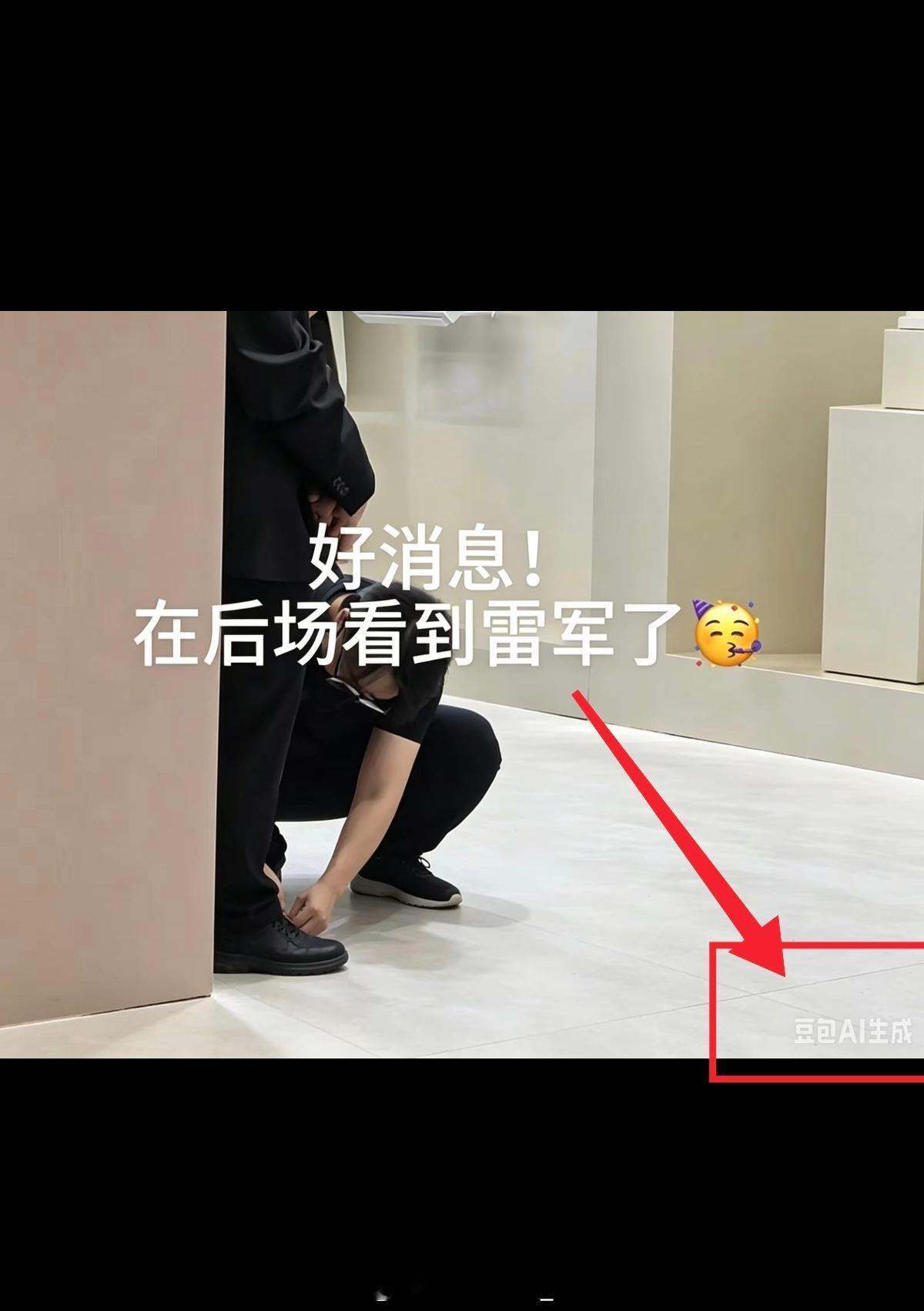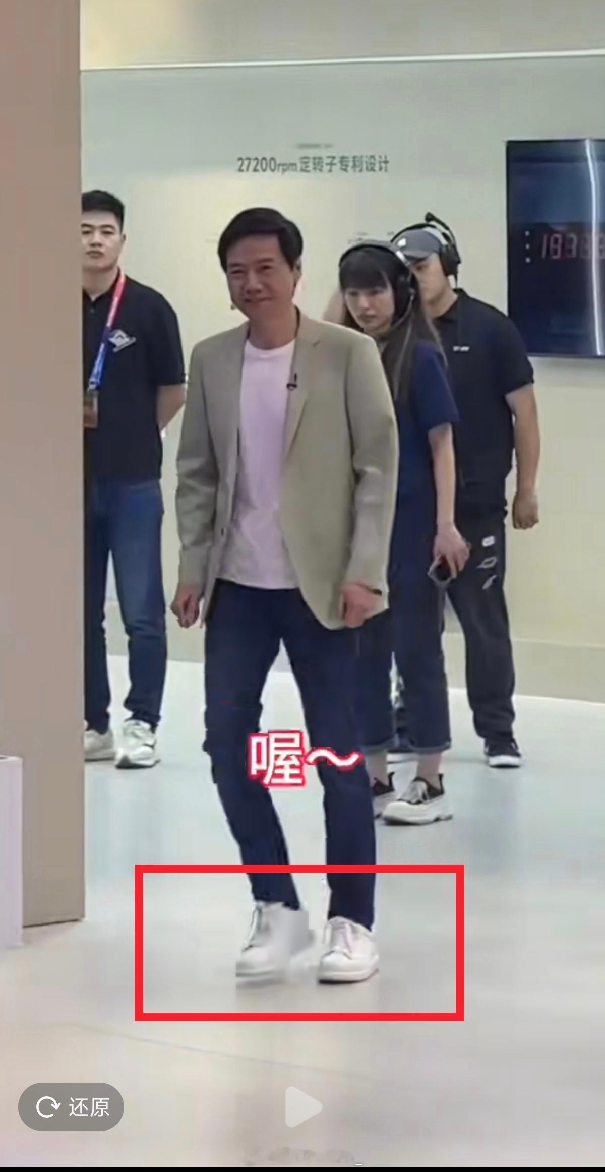 【关键事实打脸造谣者、传谣者】(图8)当天雷军穿的是休闲板鞋+束脚牛仔裤,既没有穿皮鞋,也不存在需要“挽裤脚、擦鞋”的场景;而且工作人员全程背对着镜头,连雷军的脚都看不到,所谓的“擦皮鞋”完全是脑补出来的谣言。