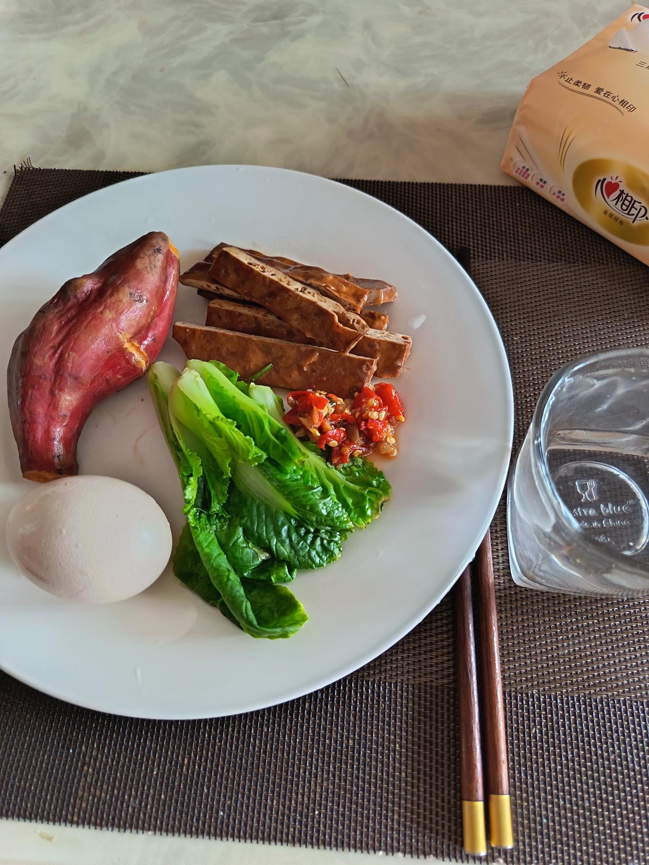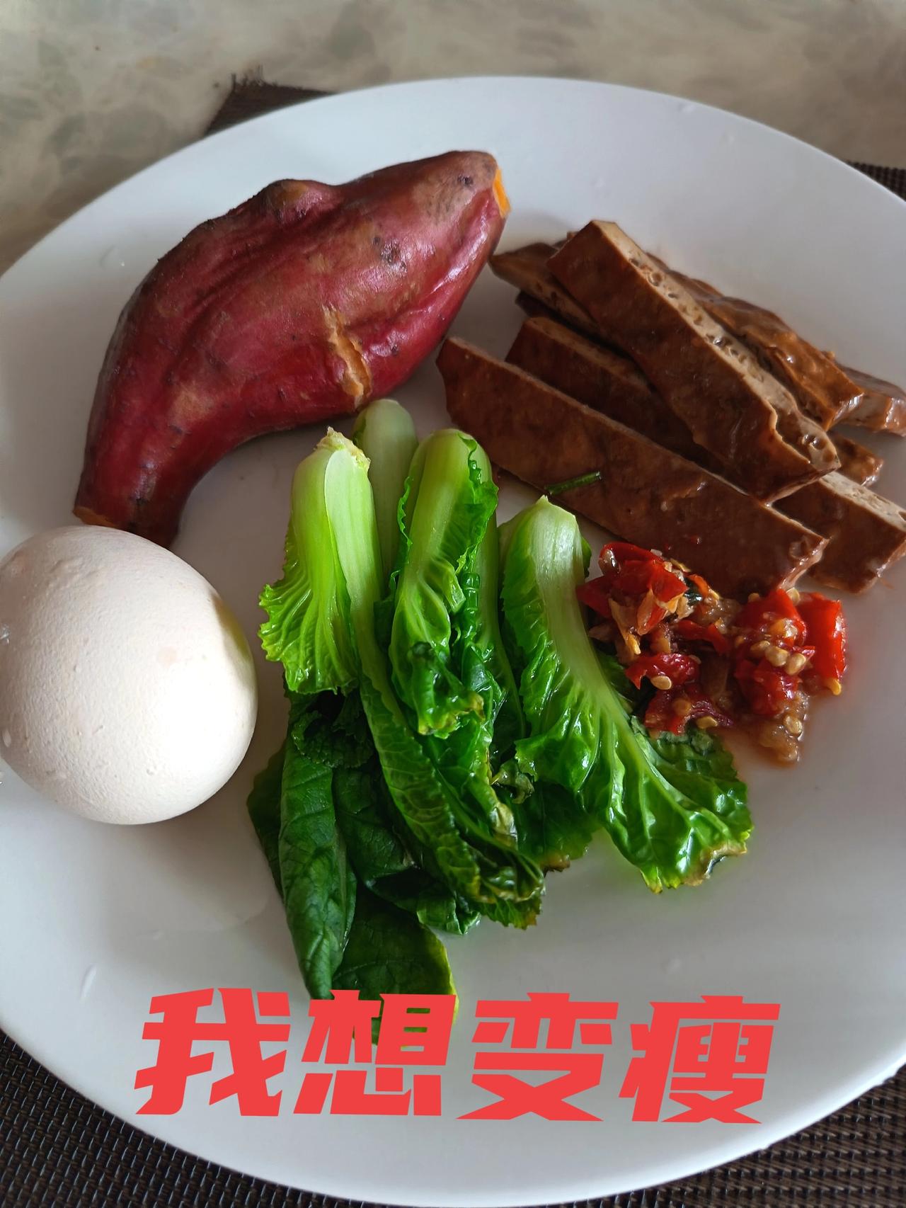 熟悉我的铁粉们都知道,老王减肥减了20多年,最重的时候238斤,最轻的时候也有170斤。 一路折腾了20多年,这20年从来没有离开过健身房,钱没有少花。 06年刚从深圳回来,在江西南昌“南方会所”,就办了一张健身年卡6800元。 现在便宜多了,一年一张卡1480元,还送两个月。 在健身房除了自己训练,还不定期的请私教,买过蛋白粉,氨基酸。 我没吃两三天, 就停下来了,实在不习惯咽不下。 还有一点,我这个人胆小,怕死,据说里面有高科技,我怕对肾脏不好,…… 现在每天除了下午5点钟去健身房打卡,有时候早上起来也在户外超慢跑,运动从来没有离开过。 效果甚微,就是这张嘴巴没有控制好。 没有办法哟,也知道这是我的短板,但是反人性的东西太难了,太痛苦了。 所以就继续折腾吧。 今年我的目标,7月份争取减到180斤。 我们不能光说吊在嘴巴里,要落实在行动上。 看看,我今天的早餐,也是中餐。 一根红薯,一个鸡蛋,一点青菜,还有几块香干,实在是太清淡了,我又整了一小勺辣椒酱。 太痛苦了,减肥只能这么吃,要不然真的瘦不下来。 旁边还有一杯凉白开,可以加快人的新陈代谢。 老王减肥在路上,网友们给我点点赞,鼓一把劲吧! 奥利给,我一定能行。