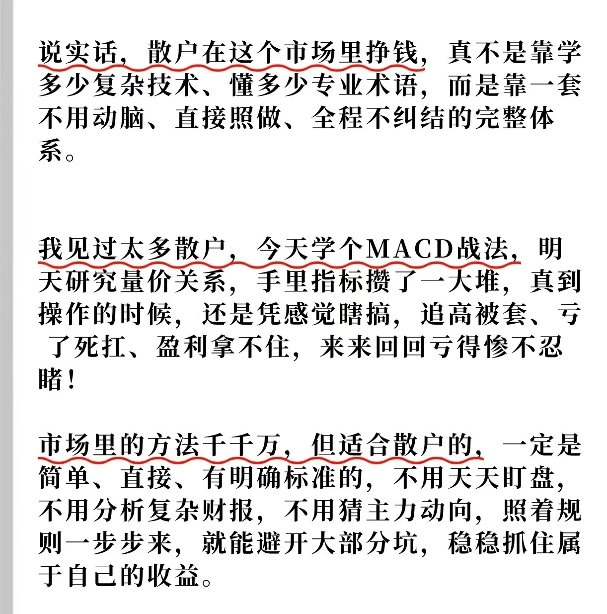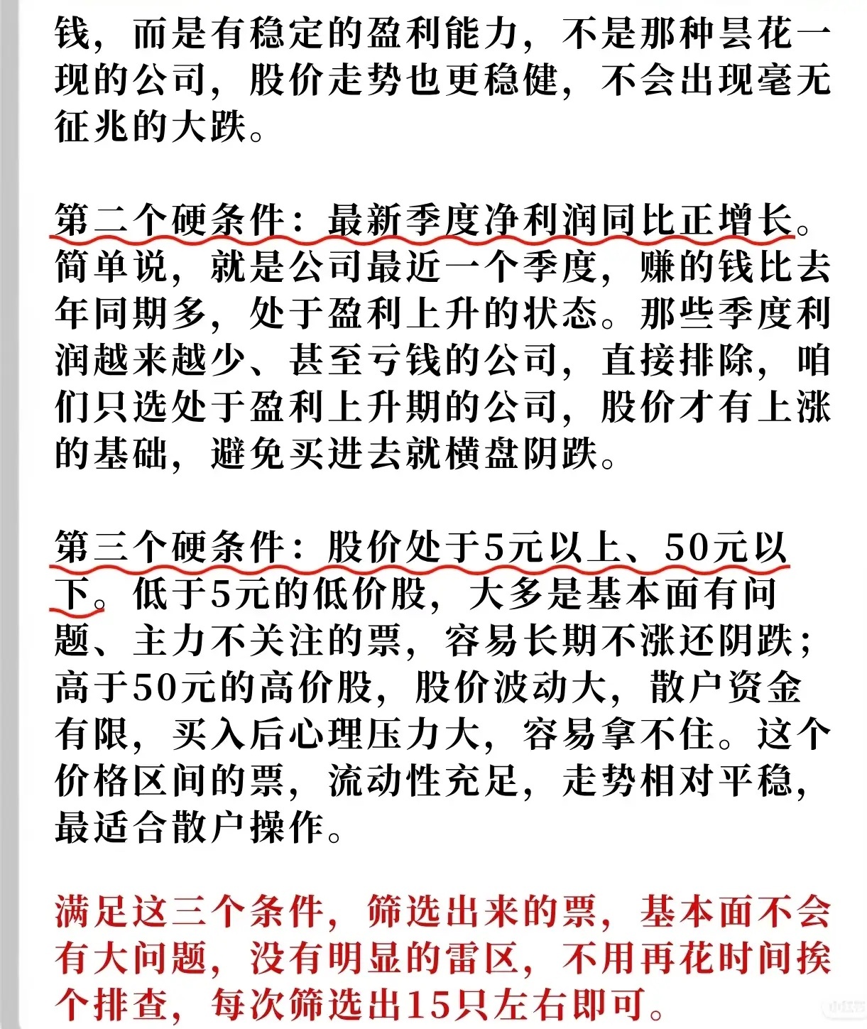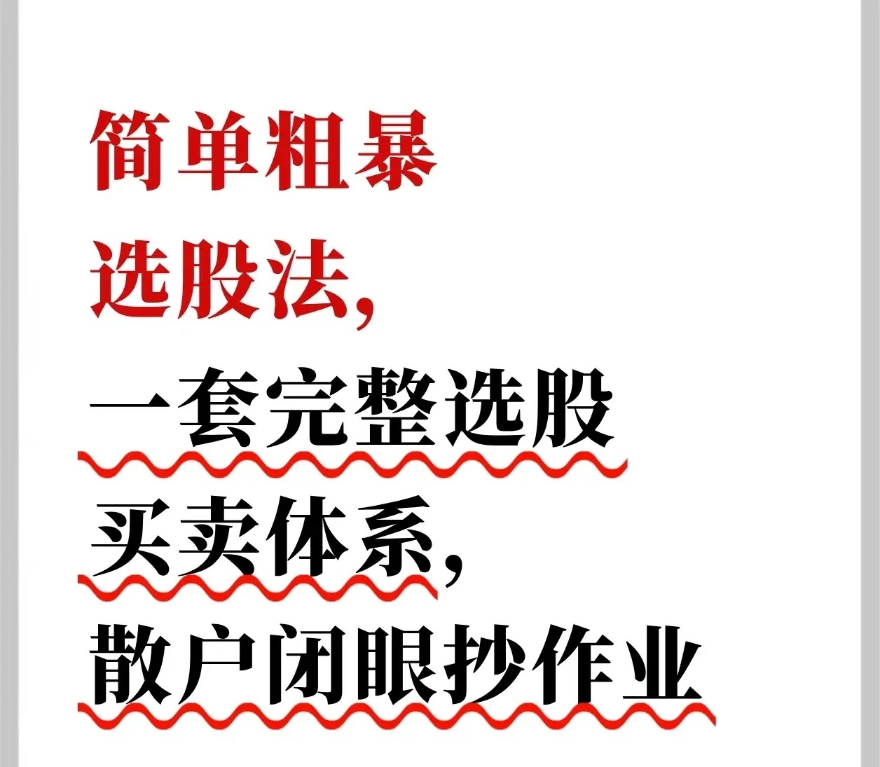 简单粗暴闭眼抄作业选股法散户选股不用复杂分析,这套通俗粗暴的方法,普通人直接套用就行。炒股好比挑代步车,不选破旧故障车,只选车况好、路况顺、价格合适的,简单三步就能筛出靠谱股票。第一步先排雷,直接拉黑ST问题股、频繁暴雷亏损股,这就像买车先排除事故车,从根源避开大亏风险。第二步选热门优质赛道,紧跟市场主流热门板块,不碰冷门无人关注的小众行业,如同选车流平稳的大路,行驶更顺畅。第三步看趋势和性价比,优先均线向上、稳步上涨的股票,避开持续下跌的阴跌股,同时不追高位暴涨的天价股。最后牢记小仓位分散布局,不要满仓梭哈。这套方法放弃复杂技术,只守基础规则,杜绝听小道消息盲目跟风。不用深度研究财报,标准化筛选就能避开绝大多数陷阱,新手散户闭眼抄作业,稳健降低炒股风险,简单又实用,看完赶紧收藏转发!