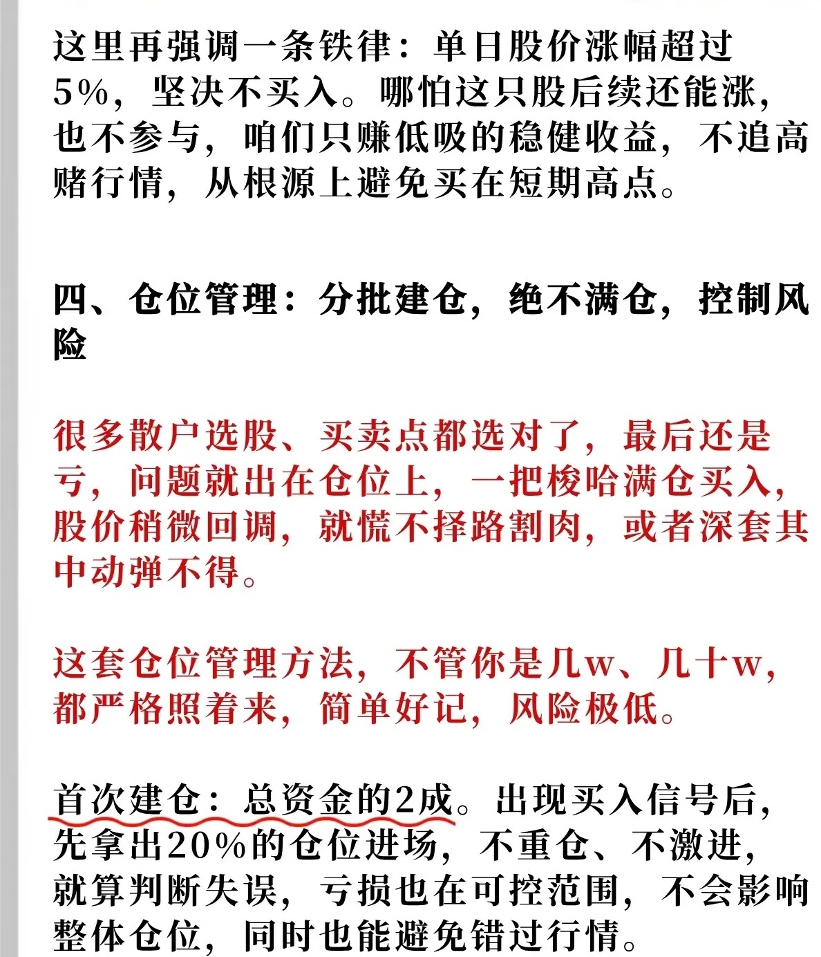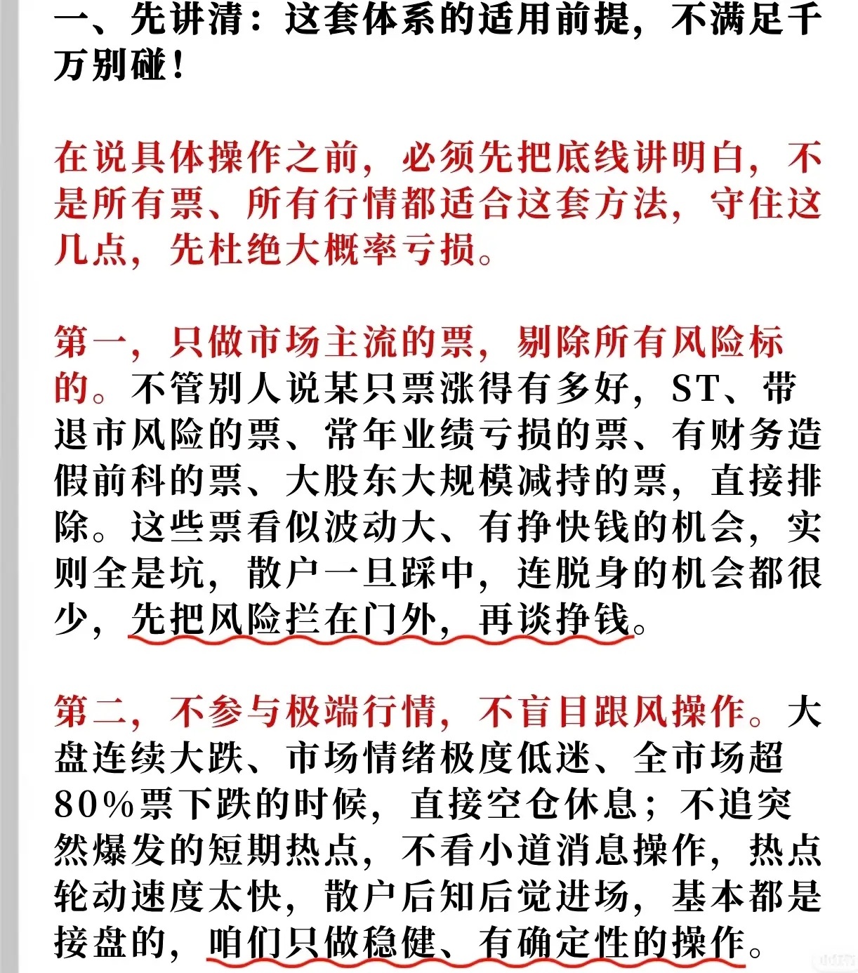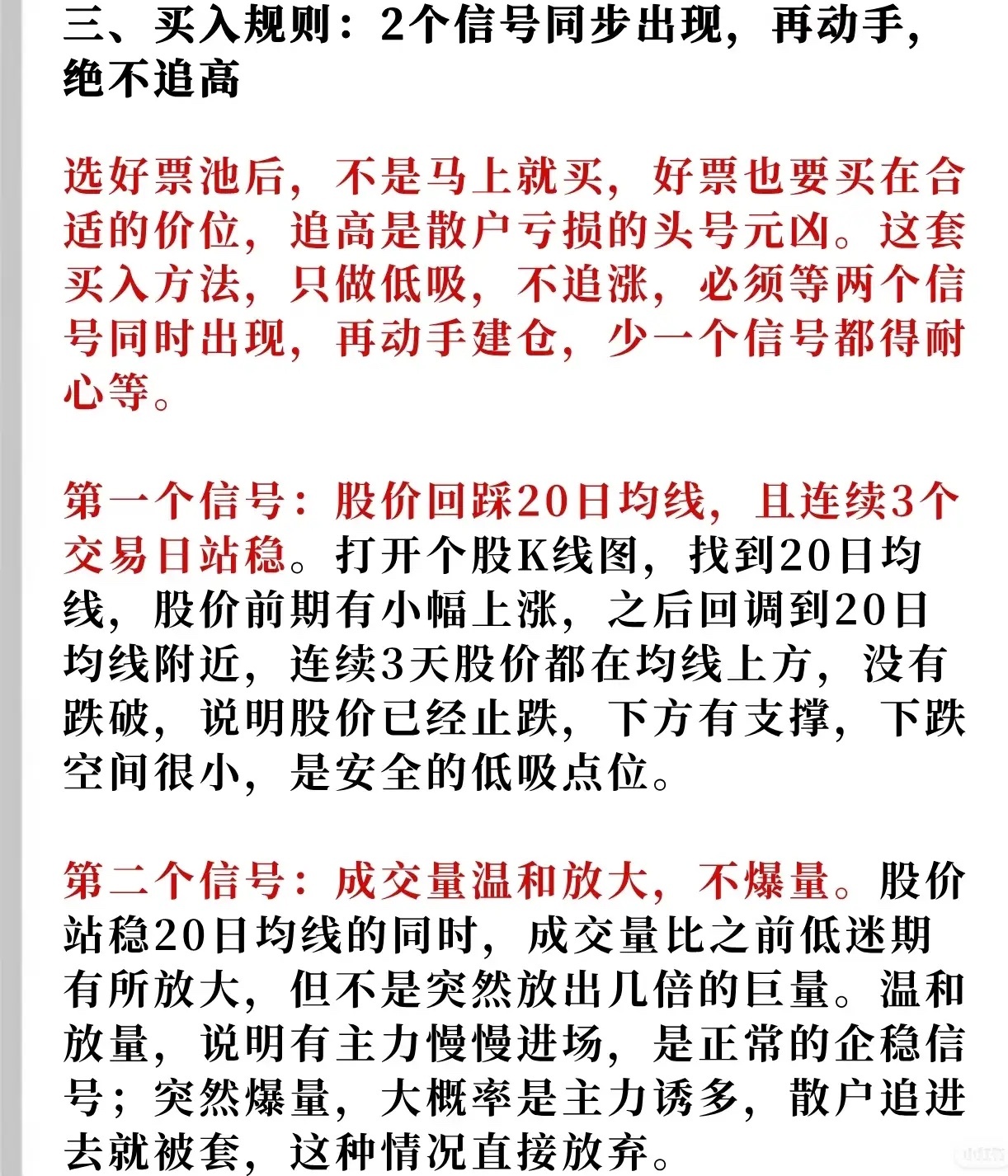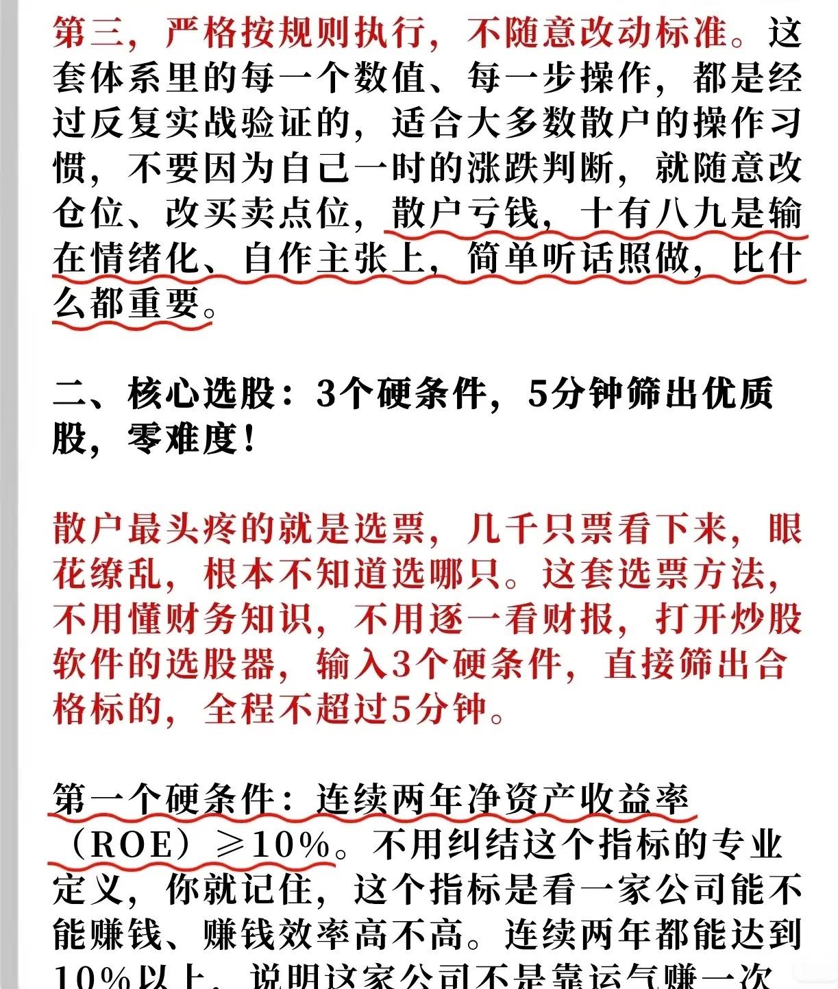 简单粗暴闭眼抄作业选股法散户选股不用复杂分析,这套通俗粗暴的方法,普通人直接套用就行。炒股好比挑代步车,不选破旧故障车,只选车况好、路况顺、价格合适的,简单三步就能筛出靠谱股票。第一步先排雷,直接拉黑ST问题股、频繁暴雷亏损股,这就像买车先排除事故车,从根源避开大亏风险。第二步选热门优质赛道,紧跟市场主流热门板块,不碰冷门无人关注的小众行业,如同选车流平稳的大路,行驶更顺畅。第三步看趋势和性价比,优先均线向上、稳步上涨的股票,避开持续下跌的阴跌股,同时不追高位暴涨的天价股。最后牢记小仓位分散布局,不要满仓梭哈。这套方法放弃复杂技术,只守基础规则,杜绝听小道消息盲目跟风。不用深度研究财报,标准化筛选就能避开绝大多数陷阱,新手散户闭眼抄作业,稳健降低炒股风险,简单又实用,看完赶紧收藏转发!