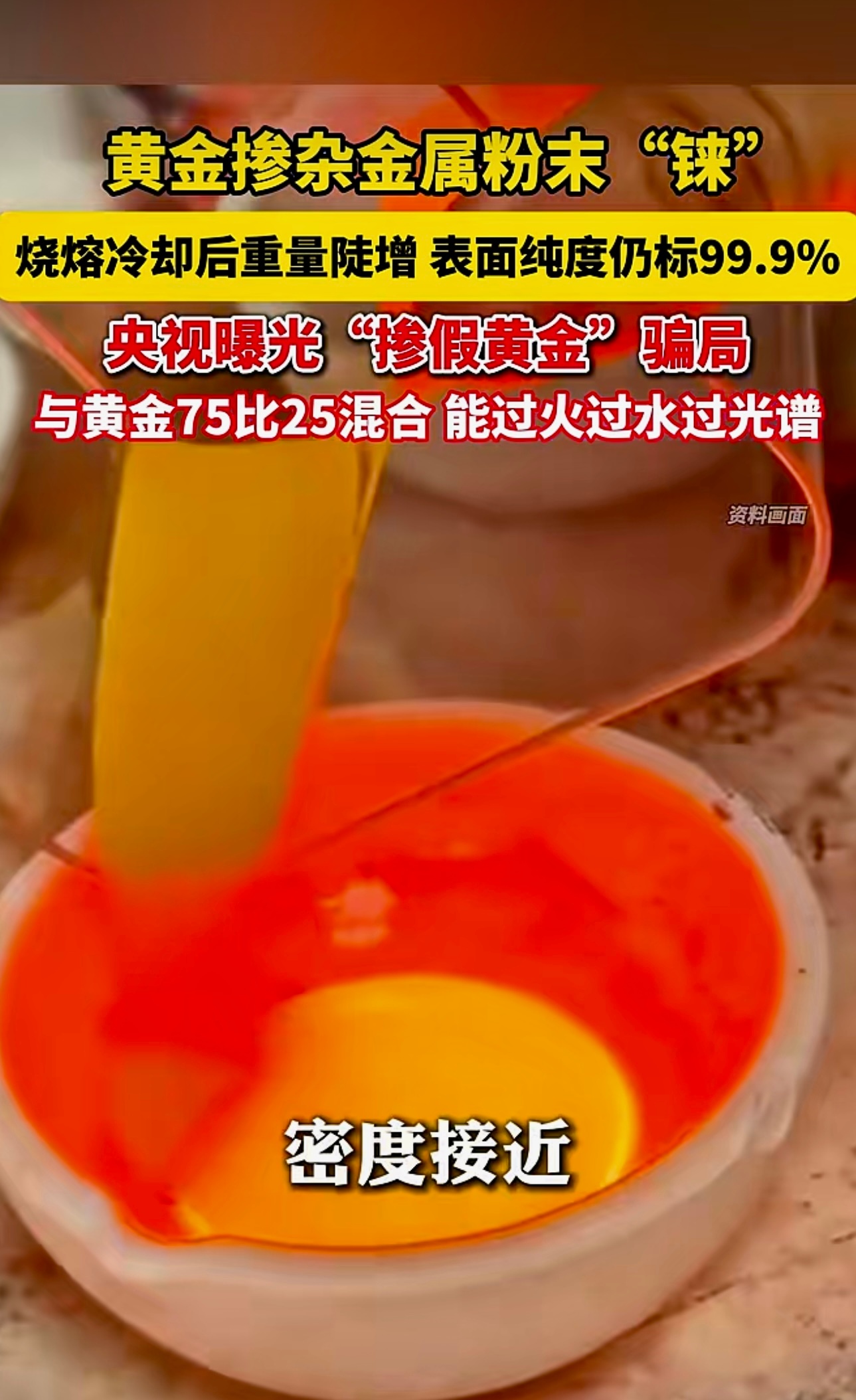 央视曝光“掺假黄金”骗局:金属“铼粉”掺入黄金高温烧熔后,有卖家宣称能增加金品重量,纯度却仍保持在99.9%!