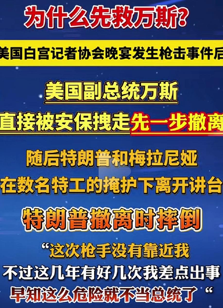白宫记者协会晚宴遭遇枪击事件,保镖先救万斯后救特朗普,这里面暴露出来的问题很大啊! 怎么说呢,只能说特朗普被警告,被针对了,因为他动了某些人的蛋糕! 表面上这是一名来自美国本土的枪手,实际上枪手的背后很有可能来自遥远的中东某个鱿鱼小国! 特朗普动了谁的蛋糕? 在美伊战争停火,就是将小以送上了不归路! 虽然内塔尼亚胡第一时间对枪手和美国特勤局进行了批评,但是,明眼人都能看出来,贼喊捉贼! 美国想要体面退场,小以不让,所以一顿操作之下先拿爱泼斯坦案中某些图片曝光威胁,特朗普的老婆不得不在白宫澄清,如今又在白宫晚宴上大张旗鼓的发动枪手对特朗普下手,其目的可想而知! 之所以动特朗普不动万斯,完全是万斯是可控的,而特朗普的变数太大了!