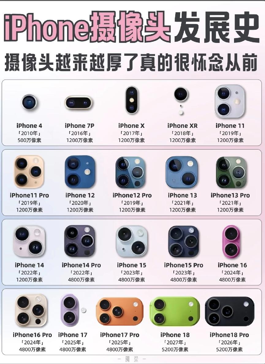 从凸起的镜头里,看iPhone的“进化论” 这张iPhone摄像头进化图,像一面镜子,照出了智能手机影像十年的迭代,也戳中了很多人的怀旧心结:镜头越来越凸,像素越来越高,可那份“轻薄感”却越来越远。 从iPhone 4的单颗500万像素镜头,到如今iPhone 18 Pro的三摄模组,苹果的影像堆料肉眼可见:从单摄到双摄、三摄,从1200万到5200万像素,夜景、长焦、视频能力早已不可同日而语。但代价也很明显:镜头模组越来越大,机身厚度被不断突破,“割手”的凸起、必须带壳的无奈,成了每一代iPhone用户的共同记忆。 这种“以厚度换性能”的选择,本质上是手机工业的无奈妥协:要在方寸之间塞下更大的传感器、更多的光学元件,轻薄和性能几乎成了一道单选题。可回头看,iPhone 4那枚平嵌的镜头,反而成了极简设计的绝唱。 如今的手机影像早已不是“够用就好”,但当镜头凸起成为标配,我们怀念的或许不只是平整的机身,更是那个“简单也能拍出好照片”的年代。技术在进步,可属于设计的浪漫,也悄悄被妥协取代了。