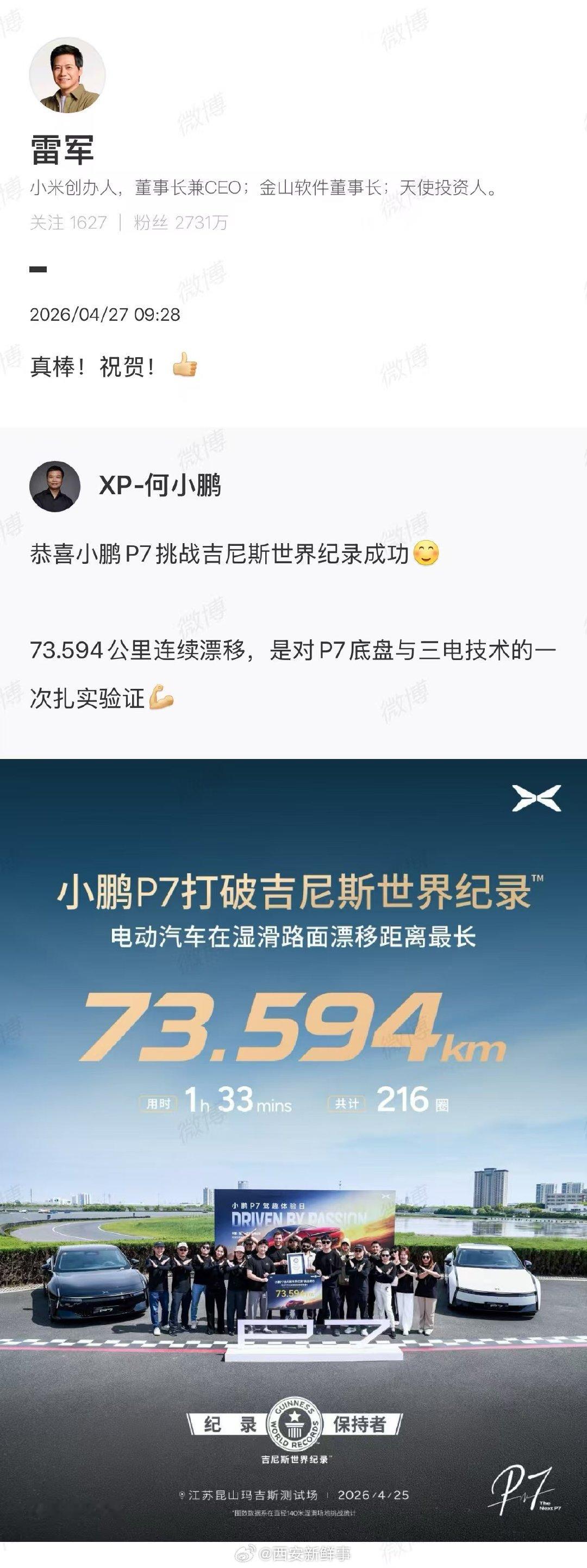 【雷军赞小鹏P7真棒】雷军恭喜小鹏P7破世界纪录4月27日,发文称,P7挑战吉尼斯世界纪录成功。73.594公里连续漂移,是对P7底盘与三电技术的一次扎实验证。