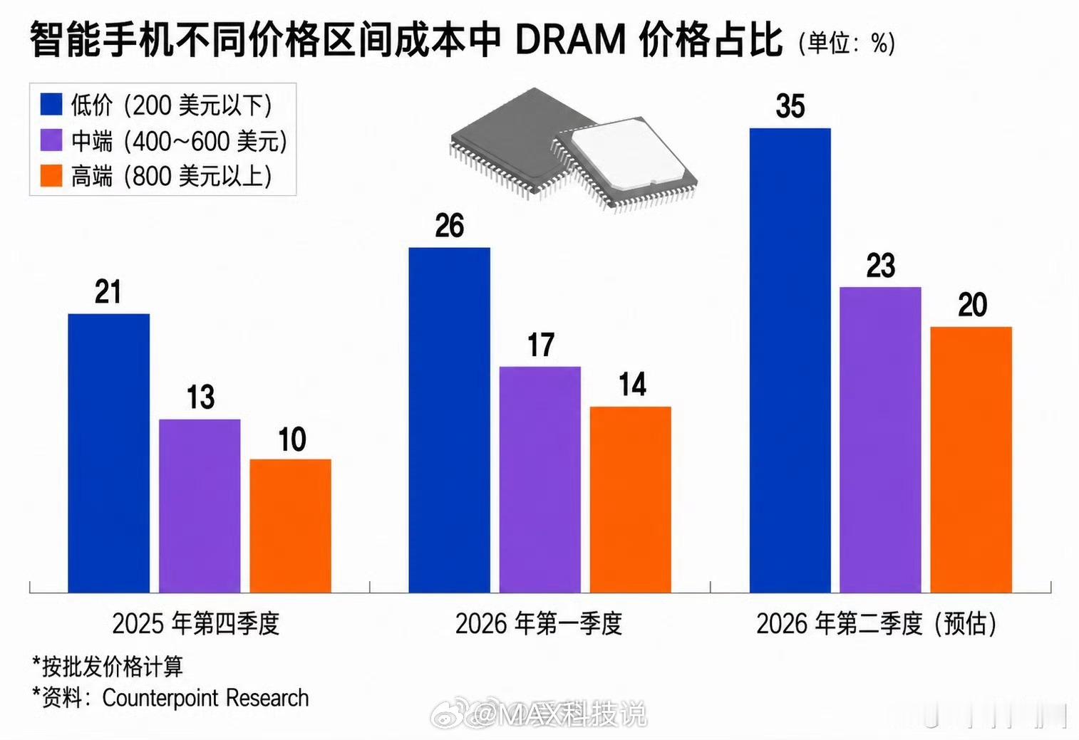 不同价位手机成本中DRAM占比200美元以下:35%400-600美元:23%600美元以上:20%
