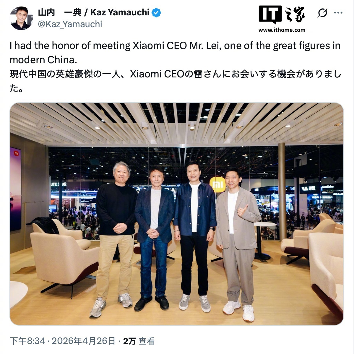 【《GT 赛车》之父山内一典称小米雷军、比亚迪王传福是英雄豪杰】2026 北京车展期间,《GT 赛车》系列制作人、山内一典在 X 平台发布了与小米创办人、董事长兼 CEO 雷军等人的合影,并称雷军为现代中国的英雄豪杰之一。