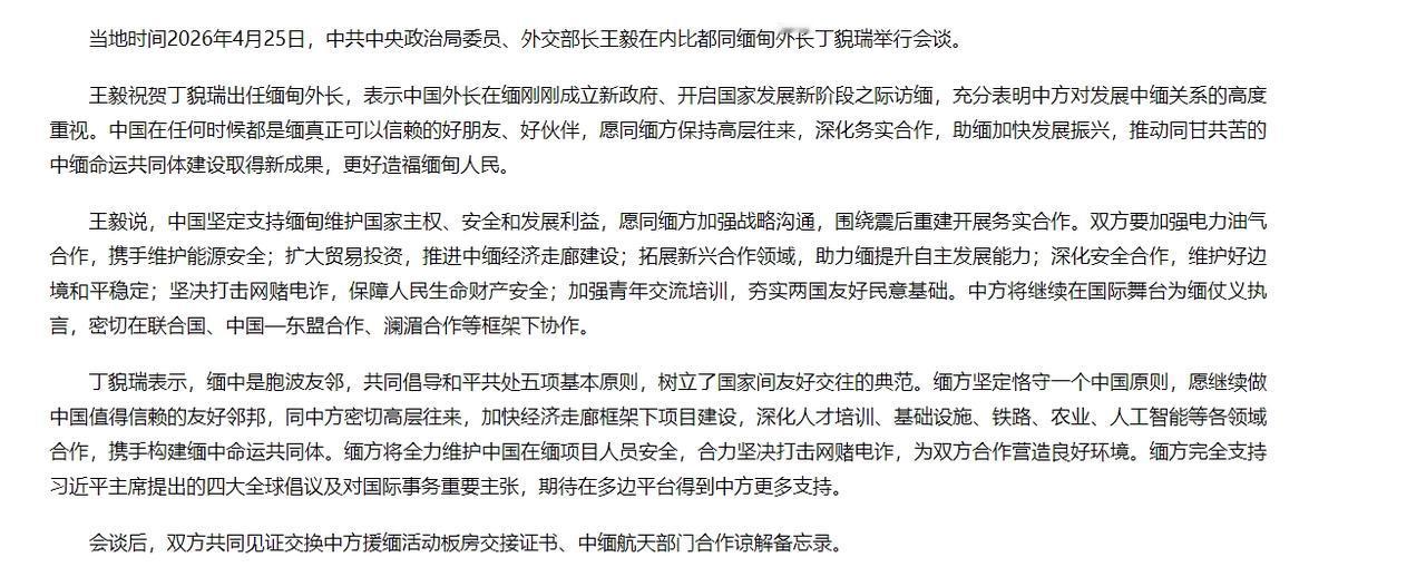缅甸答应中国了!当地时间4月25日,缅甸终于等到了中国的到来,他们十分的开心,包括缅甸外长丁貌瑞在现场均明确表态,接下来将和中国加强沟通交流,从而促成更多领域合作。4月25号,我们的王毅外长访问了缅甸,跟缅甸国家领导人敏昂莱进行了一次非常重要的会面。 这个时间点很关键,缅甸内部局势刚刚经历了一轮洗牌,新的领导层上台,内外都盯着他们接下来的路要怎么走。 是在大国之间搞平衡,还是选择一条更务实的道路?现在看来,他们用实际行动给出了答案:继续向东看,把和中国的关系放在优先的位置。 最让咱们老百姓解气的一条,就是缅甸承诺要和咱们联动,重拳出击,狠狠打击跨境网络赌博和电信诈骗,这事儿不用多说,过去几年,多少家庭因为这些藏在缅北的毒瘤而破碎。 这不仅仅是钱财的损失,更是对我们社会安全感的巨大冲击,之前我们虽然一直在施压,也取得了一些成果,但这次是由缅甸最高领导人当面向我们做出郑重承诺,分量完全不一样。 这表明打击电诈犯罪已经从我们单方面的关切,上升为两国高层的共识和共同行动,他们还把保护中方在缅人员和项目的安全摆在了突出位置。 这就像给我们在缅甸的同胞和企业吃下了一颗定心丸,安全有了保障,合作才能安心。 在政治层面,缅甸再次毫不含糊地确认,坚定恪守一个中国原则,朋友们,这可不是一句空话。 在今天这个风云变幻的国际舞台上,总有一些外部势力想在咱们的核心利益问题上做文章,缅甸作为我们的重要邻国,能够如此清晰、坚定地站队,这就是对我们最大的政治支持。 它为我们两国深化所有领域的合作,扫清了政治上的障碍,也为我们西南边境的稳定打下了一块坚实的基石,这种政治互信,是任何经济利益都换不来的。 缅甸迫切希望我们能拉他们一把,帮助他们发展经济,改善民生,他们看得很清楚,环顾全球,真心实意愿意帮助他们、有能力帮助他们的,只有中国。 双方明确要深化能源、基建等多个领域的合作,加快推进“中缅经济走廊”的建设。 这个“经济走廊”可不是画在地图上的一条线,它背后是一连串能改变国运的超级工程。 比如,中缅油气管道,这条管道早就成了我们的能源大动脉之一,让我们的能源进口可以不完全依赖马六甲海峡。 未来,在电力方面的合作会是重点。缅甸水利和太阳能资源丰富,但开发能力不足,国内缺电严重,而我们有技术、有资金。 双方一拍即合,搞跨境电网,联合开发水电站、光伏项目,不仅能点亮缅甸的千家万户,推动他们的工业化,多余的清洁电力还能输送到咱们的云南等地,实现真正的互利共赢。 依我看,这次缅甸的表态,既是审时度势的明智之举,也是历经波折后的必然选择。 他们内部的动荡和冲突,根源还是发展问题、民生问题。靠谁都靠不住,只有靠自己,同时抓住身边最可靠的机遇,而中国提供的,正是一个基于互相尊重、平等互利的合作范式。 中缅关系这次可以说是迎来了一个新的高潮,这不仅稳固了我们的西南边陲,也大大提升了我们在整个东南亚地区的话语权。 大家觉得接下来在推进这些合作,尤其是打击电诈这种老大难问题上,缅甸方面可能会遇到什么样的内部阻力? 信息来源:外交部
