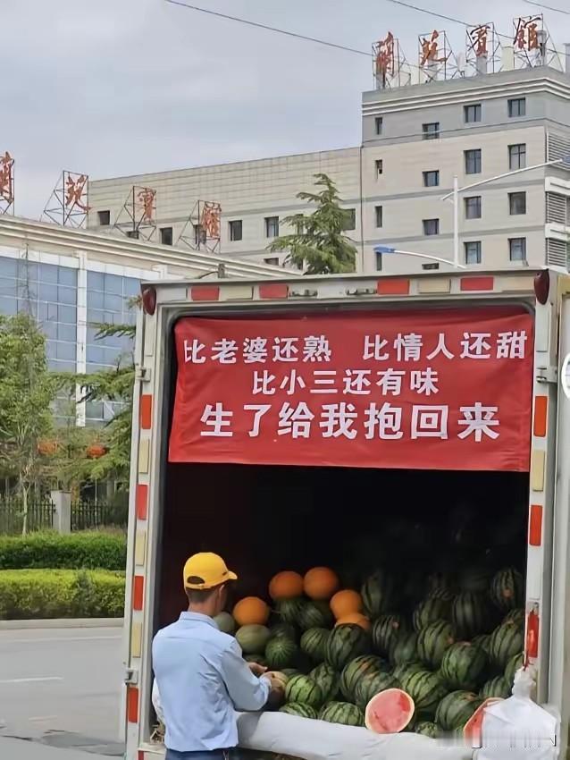 这位瓜农也太有才了!这广告条幅文案直接杀疯了,把吃瓜的浪漫和霸气都玩明白了。 就冲这比老婆还熟、比情人还甜的瓜,还有“生了给我抱回来”的售后,必须来一个!