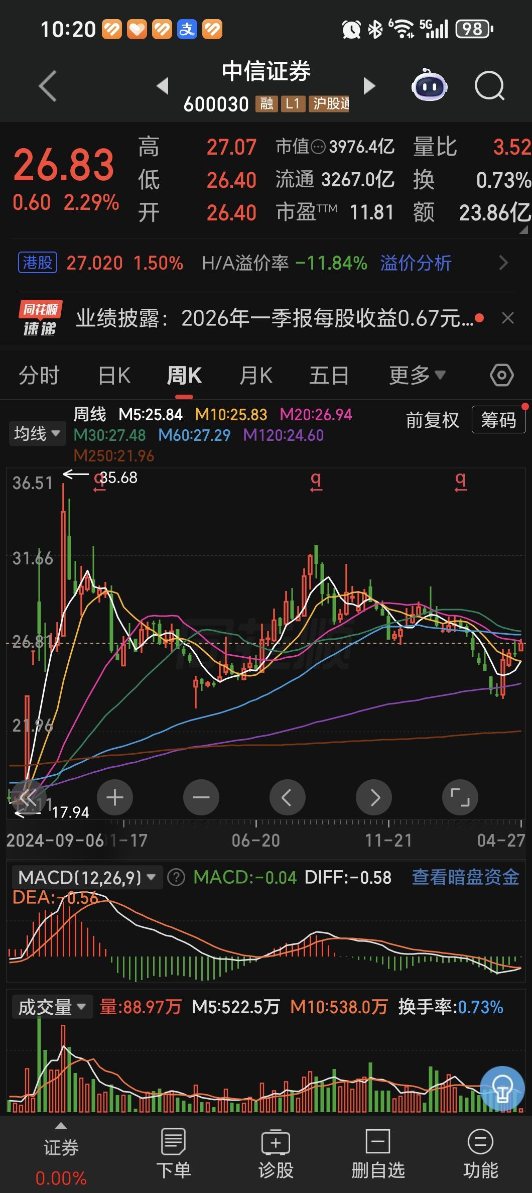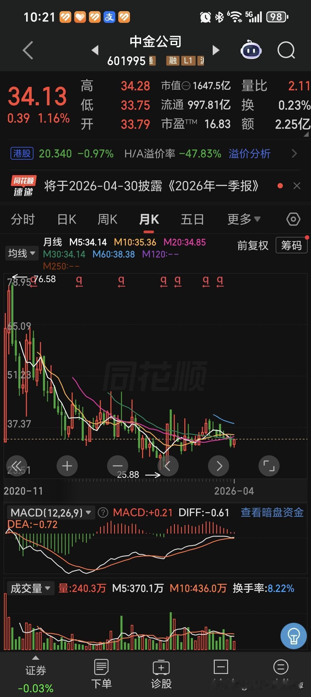 券商现在的状态,是跌很难跌下去,涨的可能不会那么急着涨,但是总体来说,这个位置是可以去做底仓的。 如果我们看中心处女座这种走势的话,就是探到一个底之后,然后回来在均线压制的这个位置呢,可能有一个横盘,或者是再往下探一下回踩均线的一个动作啊,然后再往后可能就是啊,要这个振动往东北去,大概率的一个方向就是这样。 如果看中金公司的月线图的话,他其实现在在一个长期的低位嗯,这种也是比较明确的一个形态。 国投资本现在这种走势呢?好像十几连阴了,已经跌到了前期的一个相对低的绝对的位置,这种位置实际上再往下探一下也不是没有可能,但是概率不会那么高。 因为它的市净率如果破的比较厉害的话,是比较难看的,毕竟还是有央国企的背景。 如果从安全和收益的相对的角度来说,券商逐渐会成为资金的优选。 就是我的资金放在里边,最起码输的概率要低一点,但是如果往上走的话,就有可能有比较明确的一个空间,现在是这个状态。