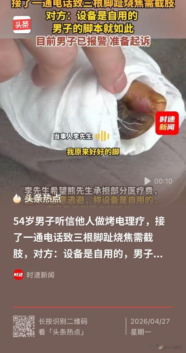 河南,一男子因糖尿病头晕,在朋友熊某的推荐下去其家中做电理疗,刚开始烤背很舒服。没成想,在烤脚时男子接了一通电话,打完电话就发现自己的三根脚趾已被烤焦,去医院后被告知必须截肢。事后,男子表示去的时候自己的脚好好的,被烤成这样熊某有一定的责任,希望能承担部分医疗费。熊某则表示,设备是自用的,他脚本来就那样。目前,男子带着照片和录像,向派出所反映情况后,等伤残鉴定结果出来将对熊先生提起诉讼! 据悉,2026年3月10日,54岁的李某患糖尿病多年,因当时感觉头晕,被熊某的推荐下到家中做电理疗。 李某来到熊某家中后,熊某用机器给李某全身上下都烤了一遍。烤到肩膀时李某感觉很是舒服。 熊某见状有效果,建议李某去烤脚。 没成想,李某烤脚的时候表示很烫,熊某则告诉李某:“烫你忍一忍,你就把脚离的远一点就行”。 李某觉得烤背的时候很舒服,以为烤脚也是一样就忍了忍。 结果,在烤脚的过程中,李某接了一个电话,等打完电话后才发现自己的脚已经烤焦了。 事后,李某去医院后,被医生告知这种情况必须截肢。 李某慌了,立马找到记者表示,自己的脚烤成这样熊某有一定的责任,希望出面赔付自己一定的医疗费用。 随后,记者打电话联系熊某,熊某则表示,不是我给他烤的,是他自己的烤的,去的时候他脚就已经那样了! 李某知道后很是气愤,决定带着当时的照片和录像,等伤残结果一出来就准备起诉熊某! 法院怎么判? 这种情况是,李某有着照片和录像证明去做电理疗时候,自己的脚是好的,理疗与脚趾损伤的如果存在因果关系,熊某就需要承担责任。 还有一种情况,李某作为糖尿病患者,自身对高温敏感度下降,需承担次要责任。 根据《民法典》第一千一百七十三条规定,被侵权人对同一损害的发生或扩大有过错的,可以减轻侵权人的责任。 在此期间,熊某在李某告知脚部发烫后仍要求其坚持,存在明显过错,仍然需要损承担赔偿责任。 根据《民法典》第一千一百六十五条,行为人因过错侵害他人民事权益造成损害的,应当承担侵权责任。 对此,大家怎么看呢?