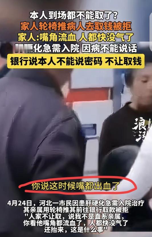 河北邢台,一男子终生未婚,得肝硬化急需住院,嫂子去银行帮他取钱被拒,银行说她不是男子直系亲属,无奈,男子坐轮椅,被亲属推着去了银行,取钱再次被拒,说他不能说密码,非本人真实意愿。嫂子怒了:他嘴角流血,病的说不了话,人都快没气了,还抬来,这是什么事?结局太解气了。 河北邢台有个叫石先生的人,这辈子没成过家,也没有孩子,父母走得早,平日里一个人生活,全靠哥哥嫂子时不时过来搭把手、照拂着。 石先生患肝硬化好些年了,谁也没想到,一场突如其来的病情恶化,差点让他没了命。 那天早上,嫂子王女士发现他躺在地上,脸色惨白,嘴角还挂着血,连动一下的力气都没有,喊他也没有任何回应。 王女士赶紧给丈夫打电话,夫妻俩慌慌张张地把石先生送到了医院,经过医生紧急抢救,才算暂时稳住了性命。 医生说石先生的肝硬化已经到了晚期,必须立刻住院接受系统治疗,而且要马上缴纳一笔不小的治疗费用,不然后续的治疗没法开展。 王女士夫妻俩没什么积蓄,根本拿不出这么多钱,但石先生一辈子省吃俭用,攒了些钱,而且他之前特意把银行卡和身份证都交给了王女士保管,还告诉了她取款密码,说万一自己有什么事,方便她帮忙处理。 于是王女士拿着石先生的身份证和银行卡,匆匆忙忙往附近的银行赶。 可到了银行,柜台工作人员听完她的来意,直拒绝了她的取款请求,没有丝毫商量的余地。 工作人员说,按照银行的规定,代办取款必须是直系亲属才行,王女士是石先生的嫂子,不属于直系亲属,不能代办,必须要石先生本人亲自来办理。 王女士急得满头大汗,把石先生病重昏迷,急需用钱救命的情况,仔仔细细跟工作人员说了一遍,甚至拿出了手机里石先生在医院的照片,恳求对方能走个特殊流程。 可工作人员只是反复强调,这是银行的硬性规定,他们也做不了主,要是破例办理,出了任何问题,他们承担不起责任。 没办法,夫妻俩只能咬咬牙,把石先生从医院抬到银行去。 他们找来了轮椅,一路小心翼翼地颠簸着,花了近一个小时,才把石先生送到了银行。 此时的石先生,虽然醒了过来,但状态依旧很差,呼吸微弱,嘴角还在慢慢渗血,整个人瘫在轮椅上,连眼睛都睁不太开,更别说开口说话、说出取款密码了。 工作人员看了一眼石先生的状态后,还是摇了摇头,依旧拒绝办理取款业务。 工作人员的理由是,石先生现在意识模糊,无法亲口说出取款密码,也没法签字确认,没办法证明这次取款是他本人的真实意愿,按照规定,还是不能办理。 那一刻,王女士所有的耐心和克制都没了,积压已久的委屈和焦急一下子涌了上来。 王女士走投无路,只能拿出手机,把现场的情况拍了下来,又联系了当地的媒体,希望能借助媒体的力量,帮他们取出这笔救命钱。 媒体很快就赶到了现场,了解了事情的来龙去脉后,立刻向相关部门反馈了情况,也对这件事进行了报道。 第二天下午两点多,银行主动联系了王女士,不仅顺利为她办理了取款业务,还专门派人到医院,向石先生和王女士一家人道了歉。 大家都明白,银行制定规则,初衷是为了保护储户的资金安全,防止出现冒领、盗用的情况,这本身并没有错。 商业银行法》也明确规定,商业银行要保障存款人的合法权益,银行按规定办事,从原则上来说,并没有问题。 可关键在于,石先生的情况太特殊了,他病重濒危,这笔钱是他的救命钱,容不得半点拖延。 保护储户的资金安全固然重要,但在这样的特殊情况下,适当变通一下,既守住规则的底线,又能保住一条人命,才是最应该做的。 规矩是死的,人是活的,不能让冰冷的规则,挡住了救命的路,也不能让人性化的服务,被死板的执行所淹没。