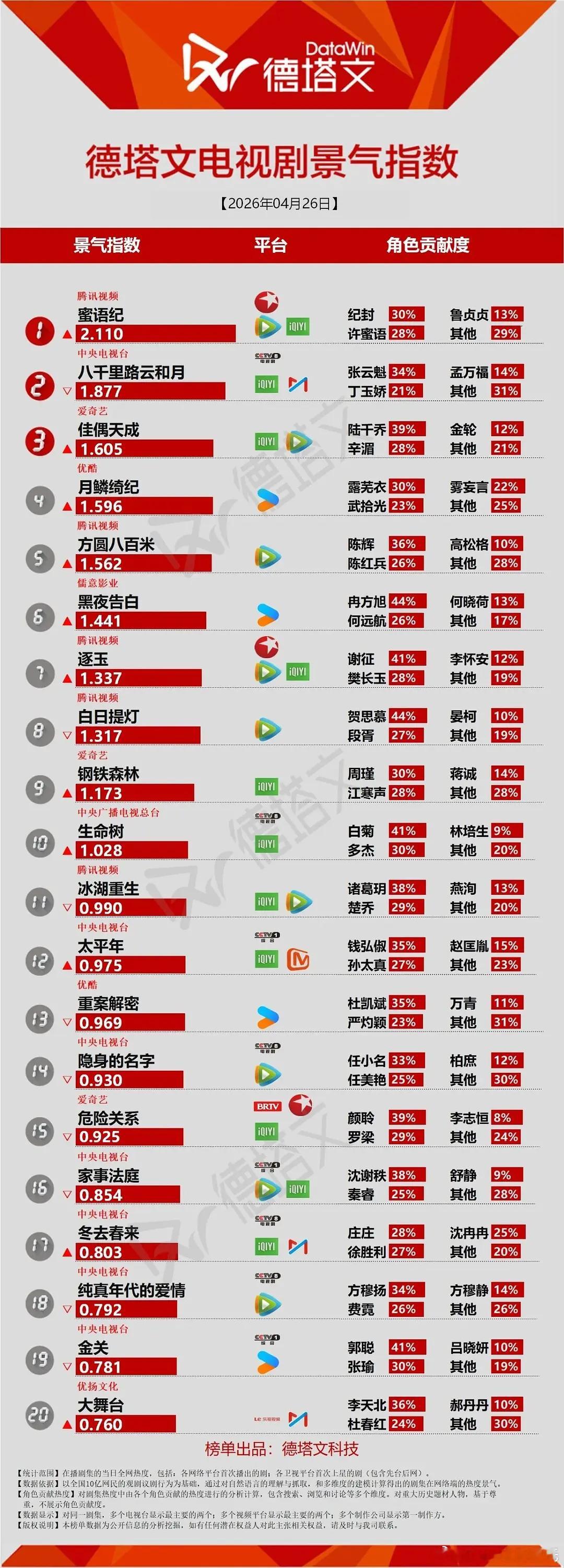 首日百指4.97万约为5w,一般首日V榜55+,个人指数只有王鹤棣冉方旭上榜的7.97,做为流量个V太低了……首日德塔文景气指数1.441还行