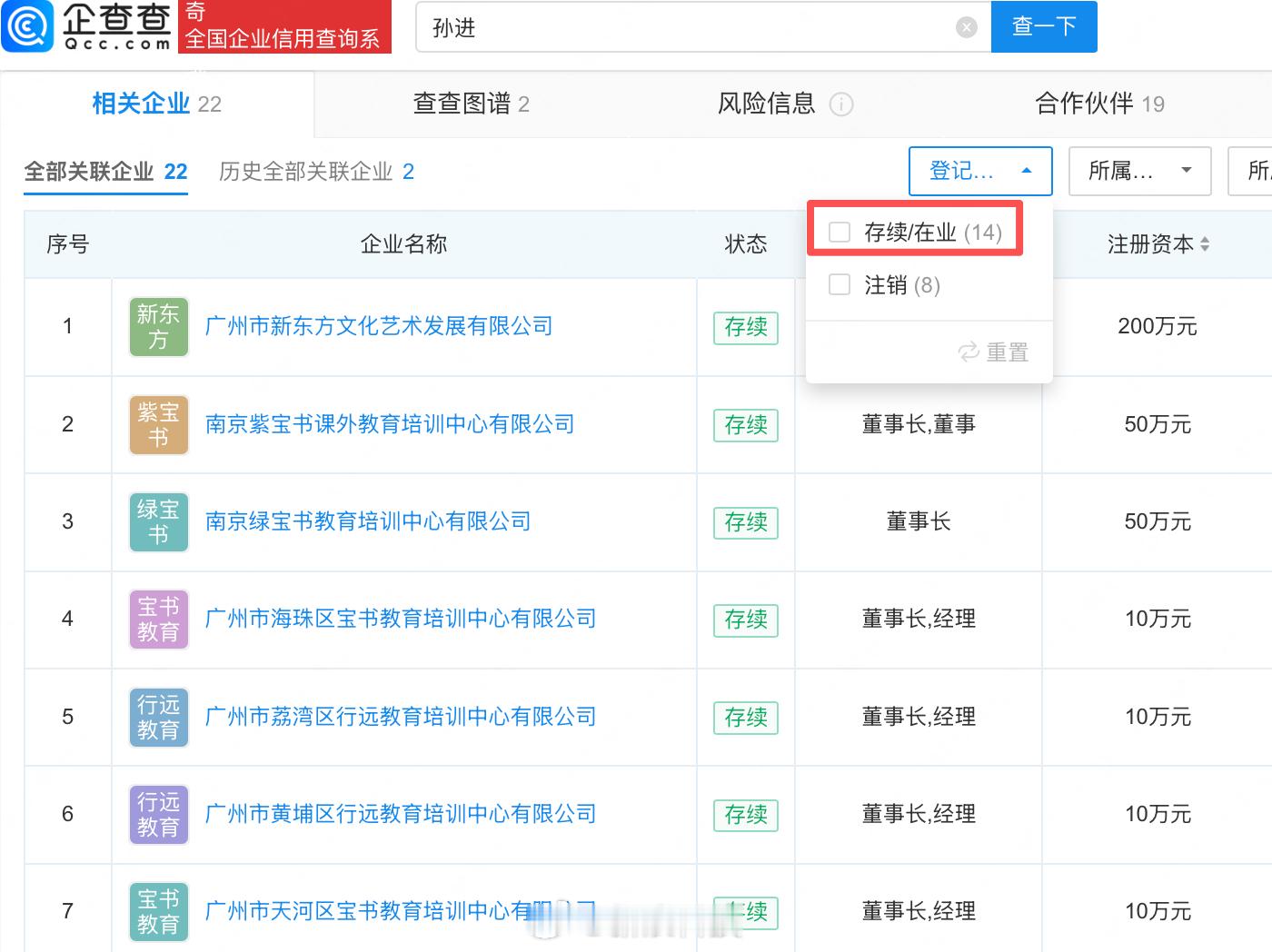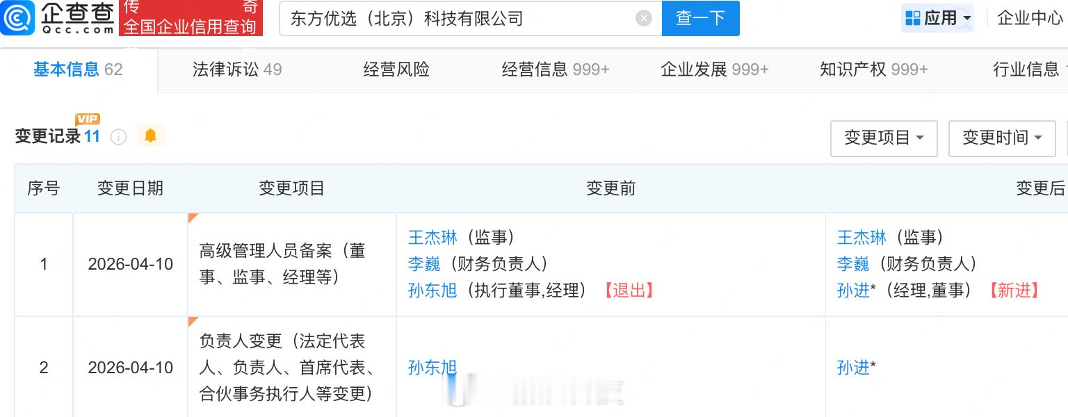 企查查APP显示,孙进目前关联超20家企业,其中10余家为存续在业状态,包括广州市新东方文化艺术发展有限公司、南京紫宝书课外教育培训中心有限公司、南京绿宝书教育培训中心有限公司等,孙进在上述企业中担任董事长、董事、经理等职务。此外,东方甄选关联公司东方优选(北京)科技有限公司于4月10日完成高管变更,孙东旭退出法定代表人、执行董事及经理职务,改由孙进接任董事、经理及法定代表人。东方甄选新CEO为何与老将难共存