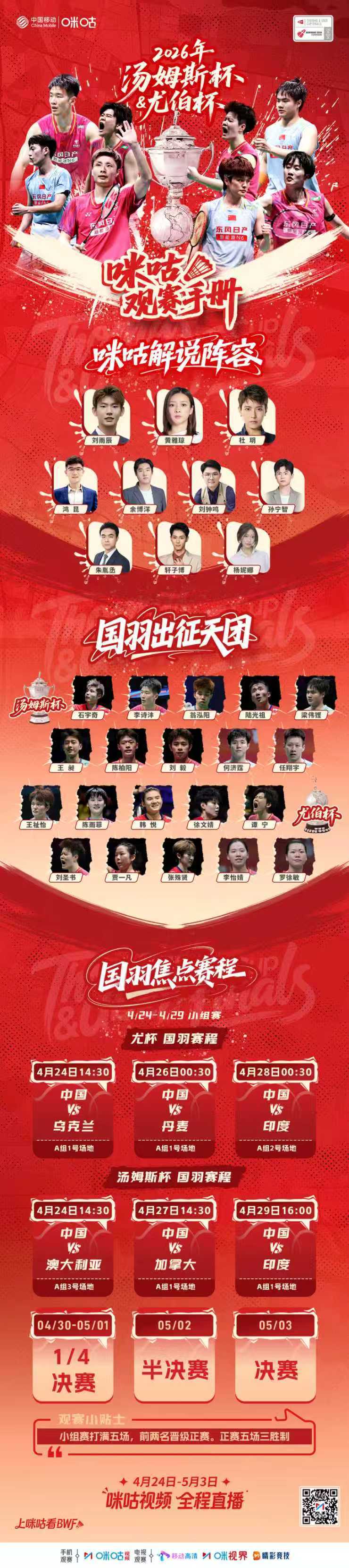 🌟4月18日-5月4日:2026年斯诺克世锦赛;🌟4月24日-5月3日:2026年汤姆斯杯&尤伯杯🌟4月28日-5月10日:2026伦敦世乒赛团体赛🌟5月1日-3日:国际泳联跳水世界杯总决赛🌟5月1日-6日:中超联赛第9、10轮🌟5月1日-4日:欧洲五大联赛争冠季🌟4月19日起:NBA季后赛 🌟5月2日、10日:UFC格斗之夜珀斯站、UFC328
