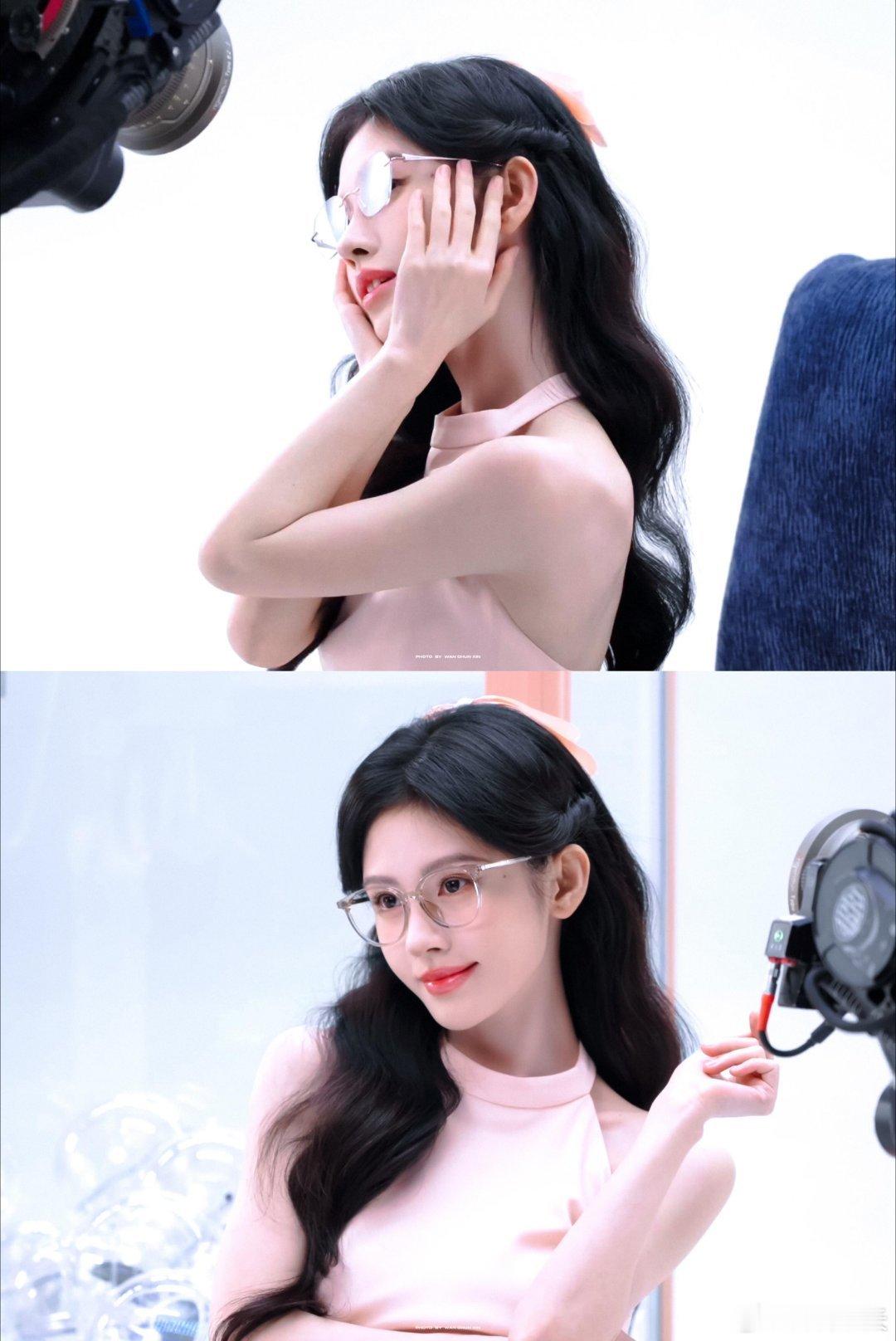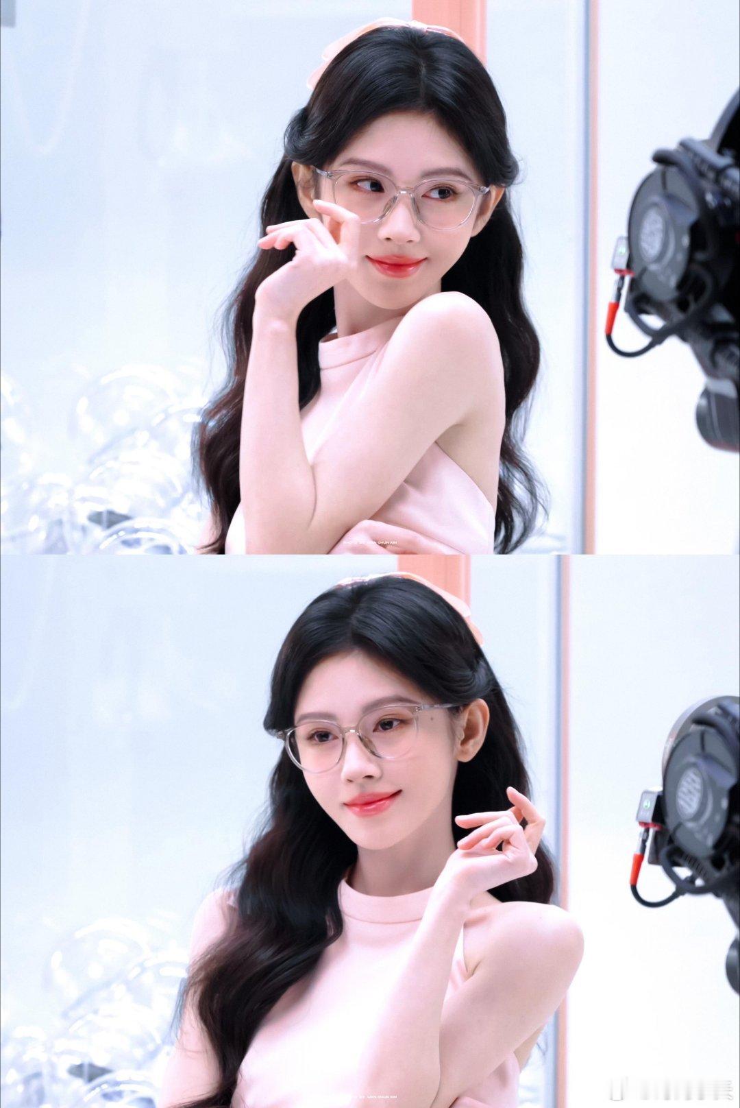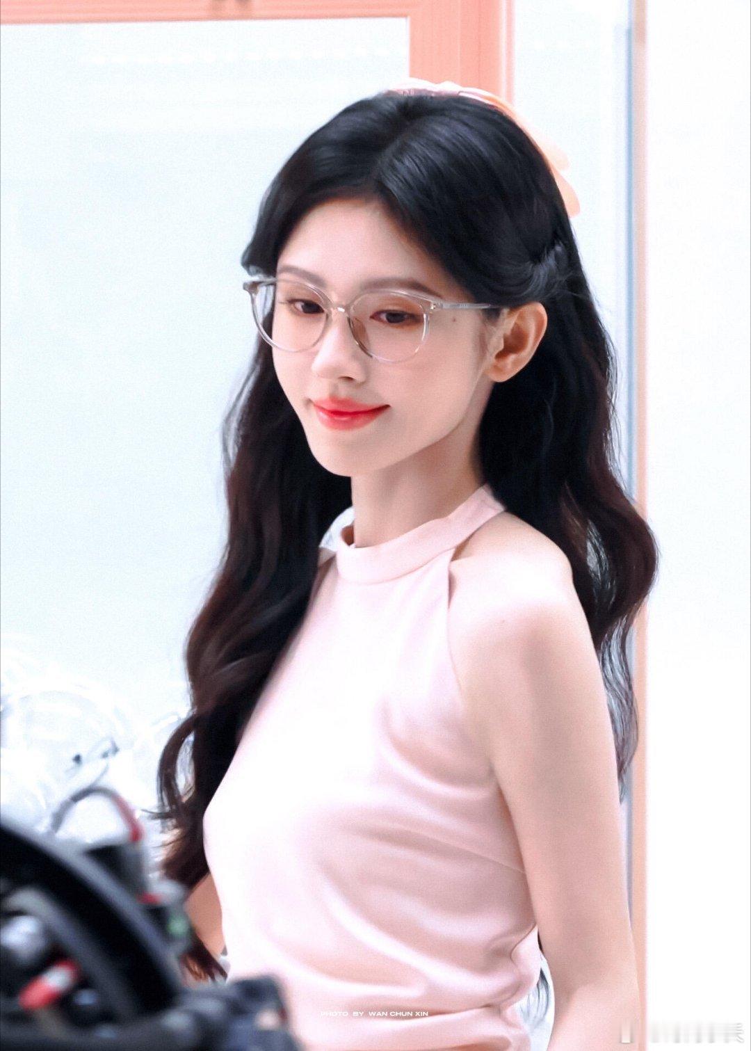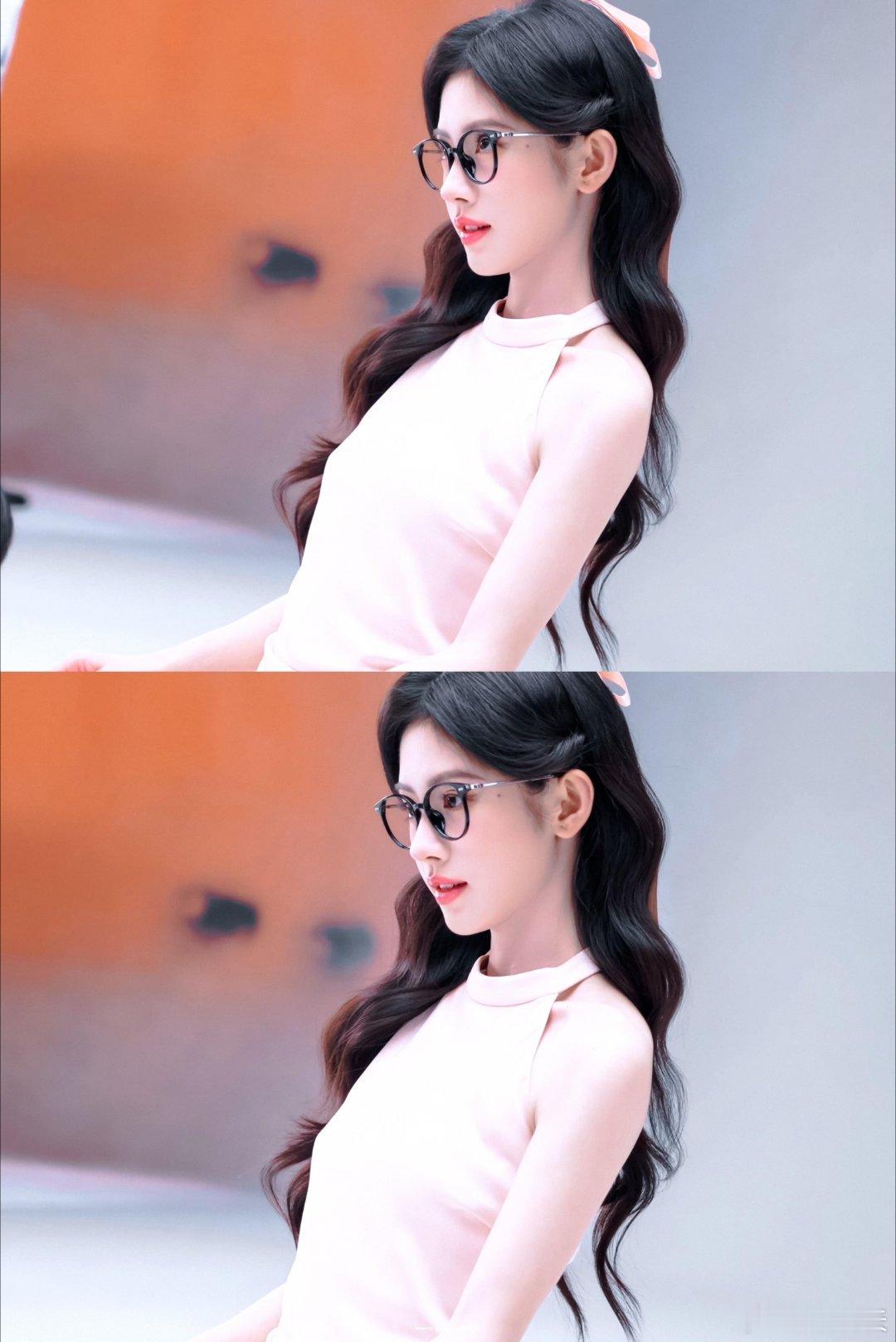 浅粉挂脖+黑长卷+细框眼镜温柔里又带点清冷感