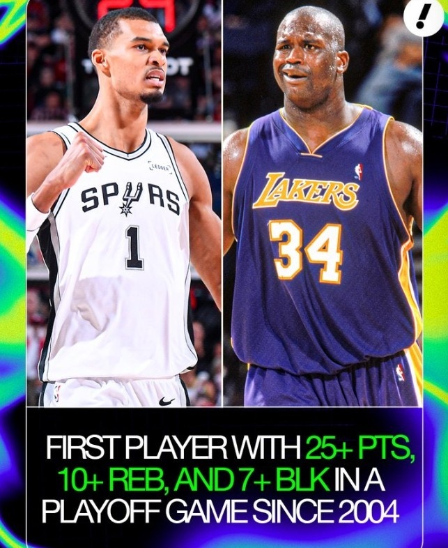 据统计,文班在季后赛单场至少25分10篮板7盖帽,自2004年的奥尼尔(次轮对阵马刺G3、奥尼尔得到28分15篮板5助攻8盖帽)后首人。